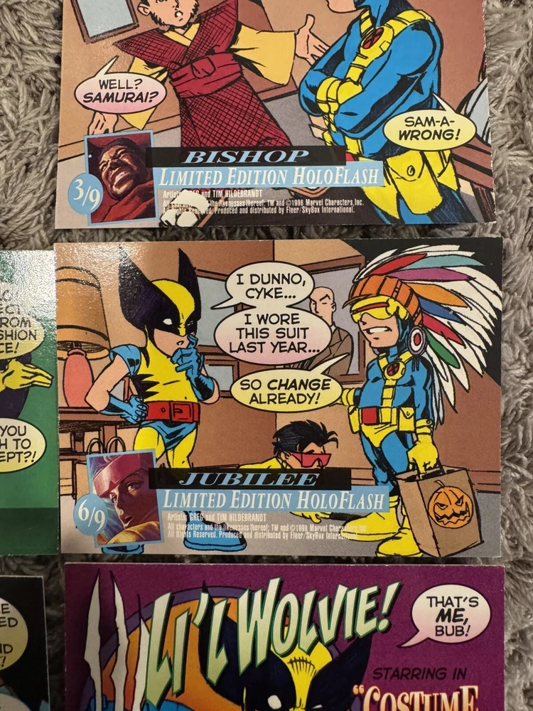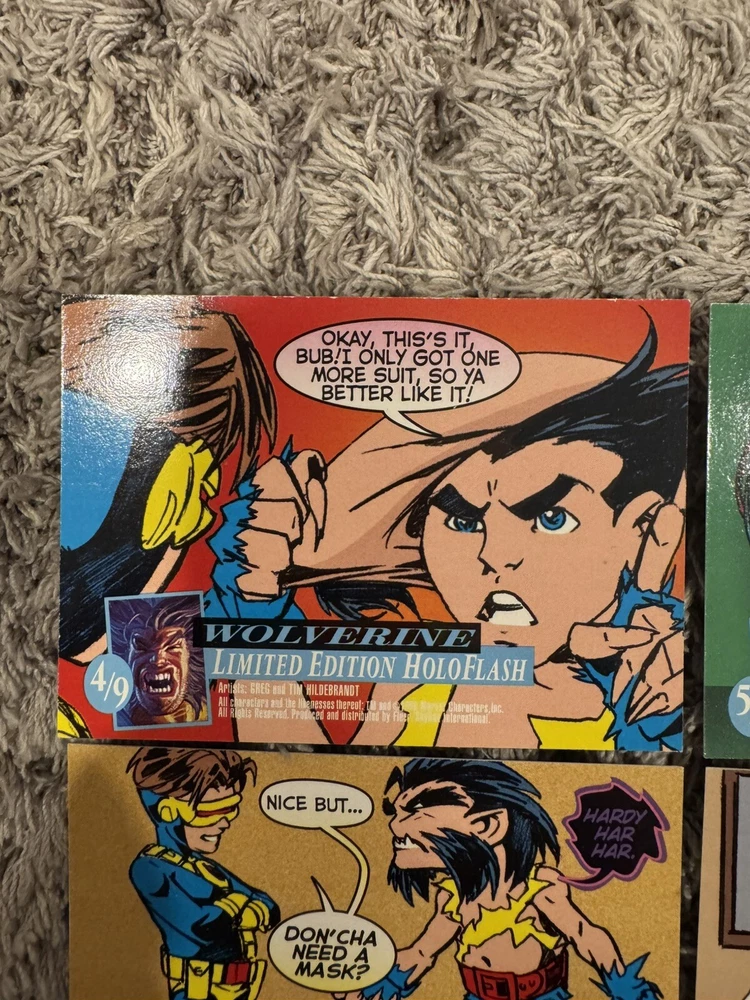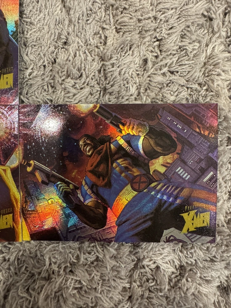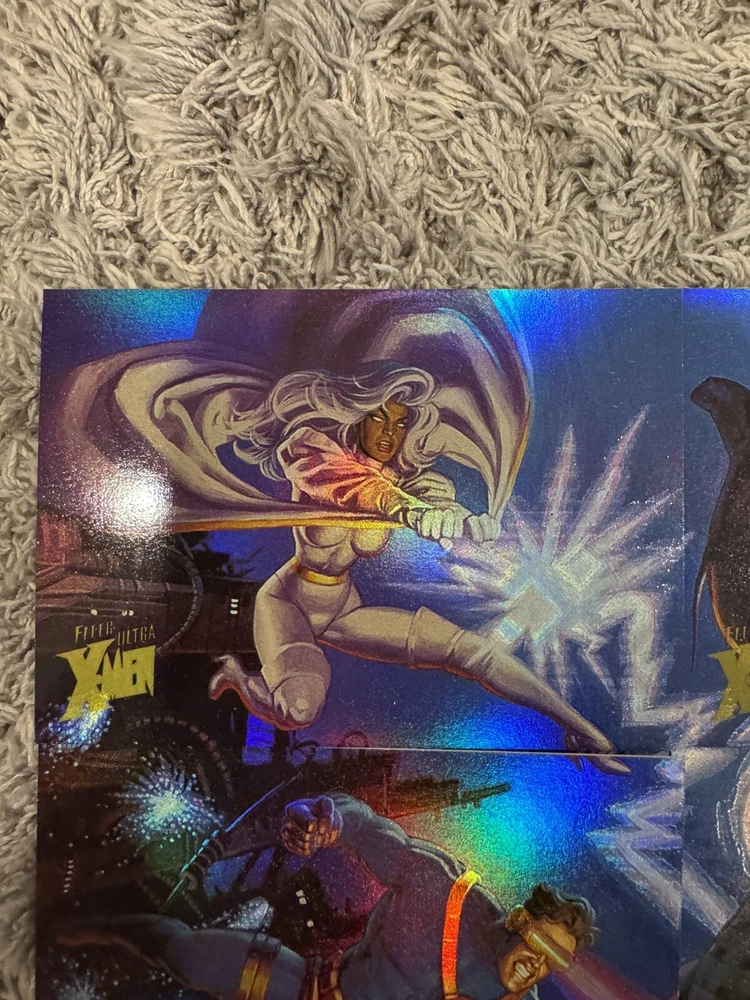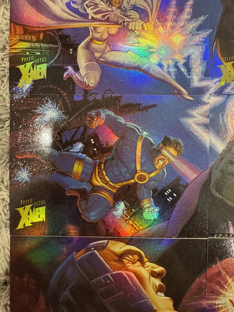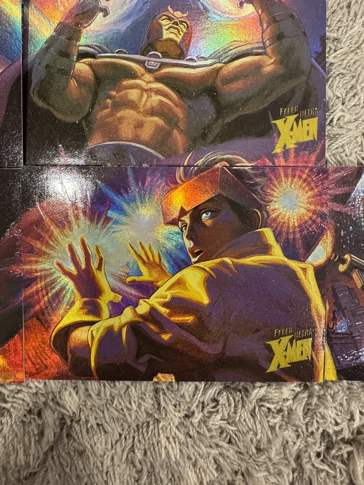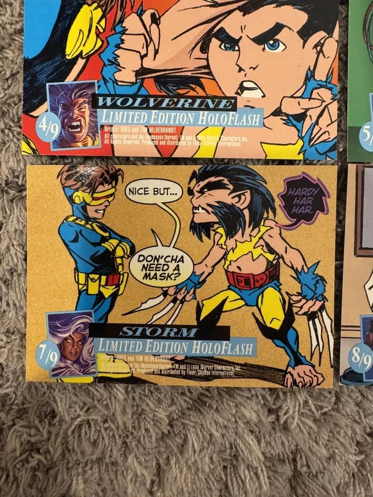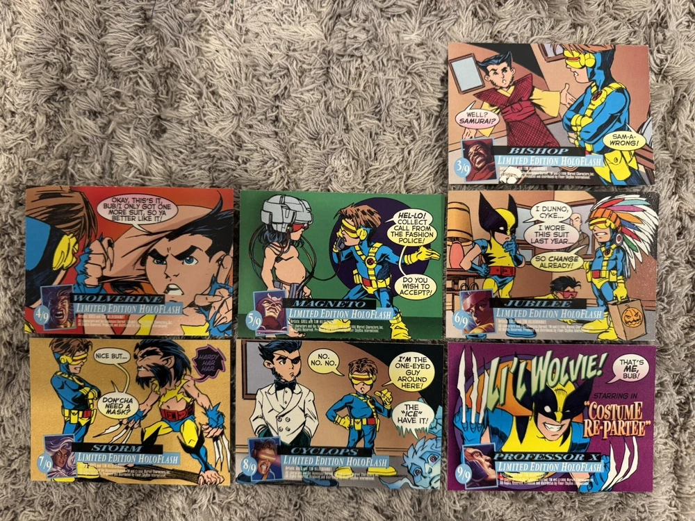 This is a 1996 Fleer Ultra Marvel X-Men Wolverine NEAR COMPLETE HOLOFLASH 3X3 PUZZLE INSERT CARD SET, #3-9! Includes an Original Pack Wrapper with purchase! Only missing 2 cards! 1 - Phoenix 2 - Gambit Set Includes: 3 - Bishop 4 - Wolverine 5 - Magneto 6 - Jubilee 7 - Storm 8 - Cyclops 9 - Professor X Condition: All cards are Near Mint/Mint. Will ship sandwiched between two thick pieces of cardboard for maximum protection to ensure they arrive undamaged and in perfect condition. Please ask with any questions.