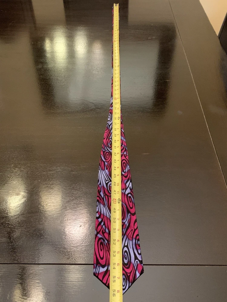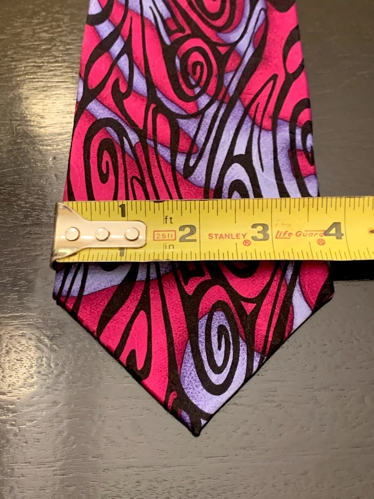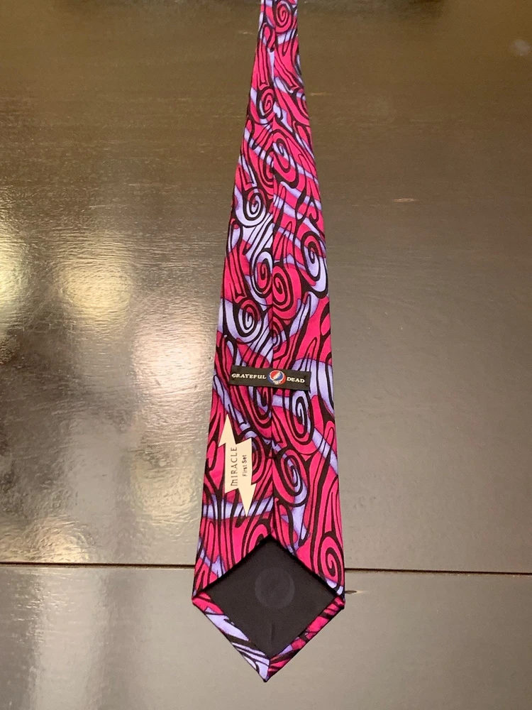 This neon fushia black tie with a hologram skull accent is the perfect addition to any Grateful Dead fan's wardrobe. The tie features a geometric pattern with skulls, the year 1996, and Jerry Garcia's name. Made from 100% silk, this vintage tie is of high quality and will make you stand out in any crowd. The tie is a wide short tie, measuring less than 57 inches in length. It is a first set tie from Miracle, a brand known for its unique and eye-catching designs. This tie is perfect for men who want to add a touch of the 90s and Grateful Dead to their outfit. Made in the United States, this tie is a must-have for any collector or fan.