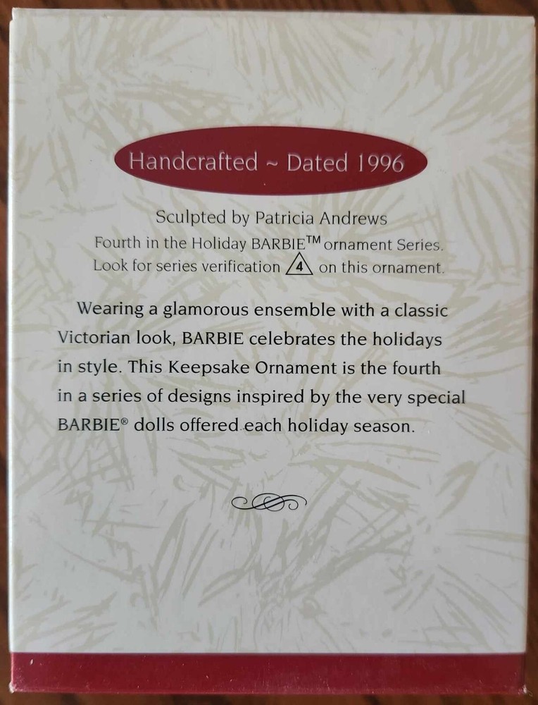 This stunning Holiday Barbie ornament is a must-have for collectors! The intricate details, elegant gown, and festive charm make it a perfect addition to any tree. The timeless 1996 Hallmark design adds nostalgia, and Barbie's pose captures the holiday spirit beautifully. Great condition, high quality, and a wonderful gift for Barbie fans. Absolutely love it!