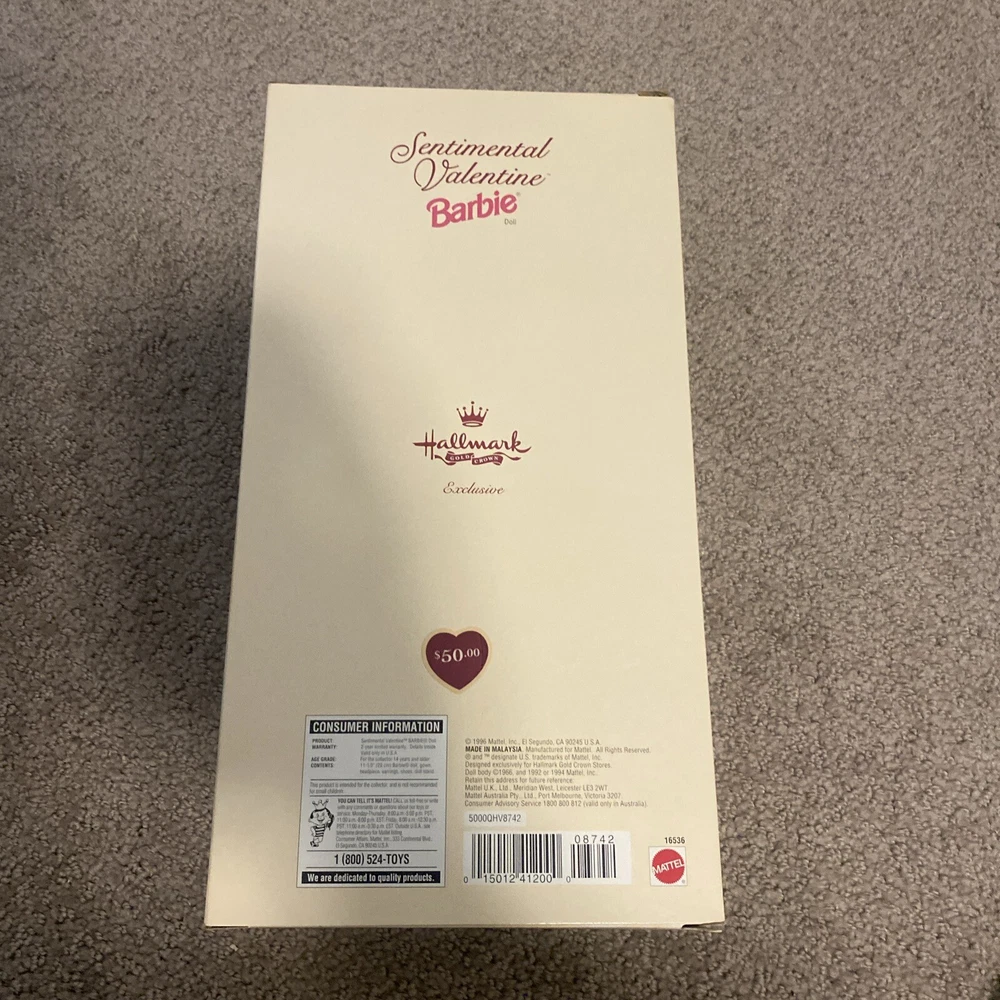 Doll Complexion: Light Item Length: 12 in Doll Hair Type: Varies Doll Hair Color: Brown Doll Gender: Girl Doll Doll Eye Color: Blue Item Weight: 1 lb Handmade: No Year Manufactured: 1996 Product Line: Hallmark Barbie gtin13: 015012412000 Artist: NA Material: Plastic Doll Age Group: Adult Character: Barbie Series: Hallmark Theme: Fashion & Beauty MPN: 16536 Antique: No Age Level: 14+ Personalize: No Set Includes: Accessories, Display Stand, Doll, Outfit Time Period Manufactured: 1990-1999 Country/Region of Manufacture: Malaysia Occasion: All Occasions Features: Collector Edition, Special Edition Franchise: Sentimental Valentine Type: Fashion Doll Signed: No Item Width: 5 in Ethnicity: Caucasian Original/Licensed Reproduction: Original Vintage: Yes UPC: 015012412000 Unit of Sale: Single Unit Packaging: Original (Unopened) Brand: Mattel Number of Pieces: 1 Doll Size: 12 in