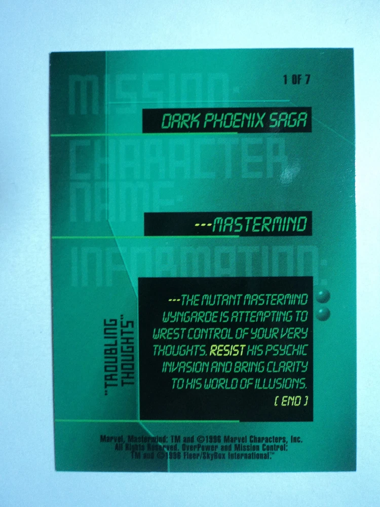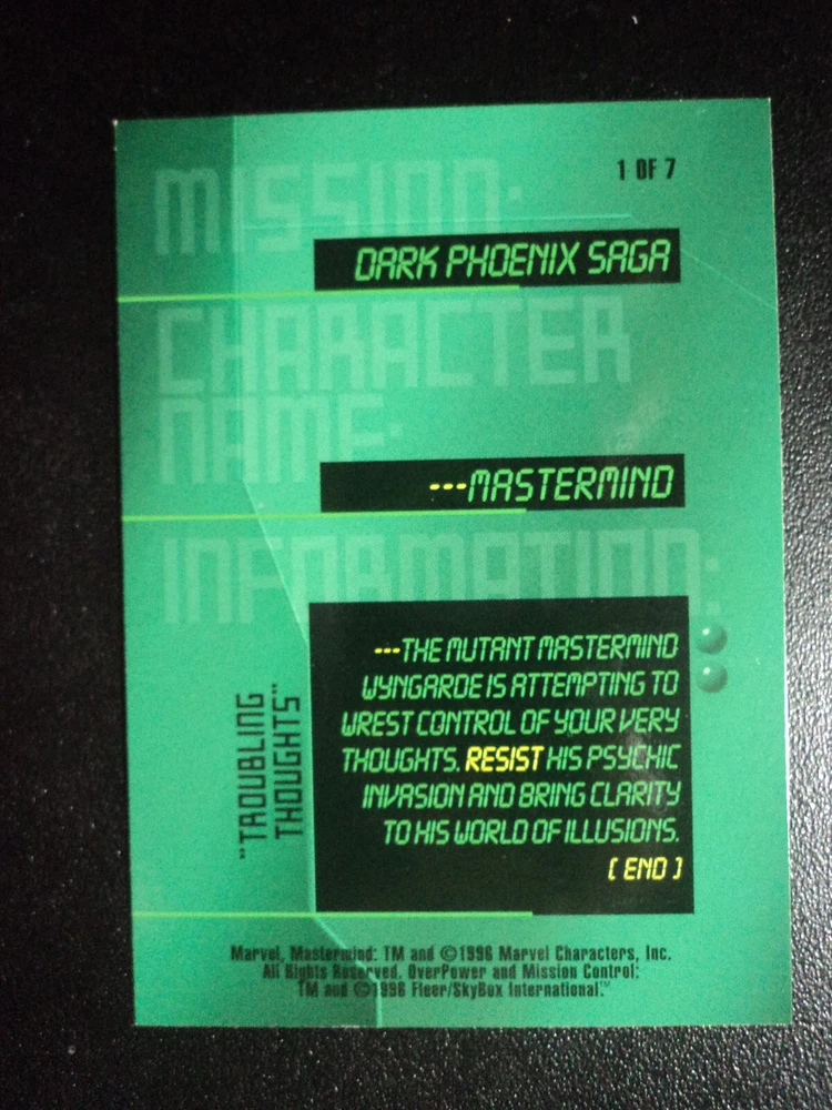 1996 MARVEL OVERPOWER - MISSION CONTROL: MISSION CARD - DARK PHOENIX SAGA ( 1 OF 7 ) Genre: Supervillian Card Size: Standard Age Level: 13+ Year Manufactured: 1996 Autographed: No Card Number: ( 1 OF 7 ) Features: Mission Card Set: MARVEL OVERPOWER - MISSION CONTROL Card Name: MASTERMIND Franchise: Marvel (MCU) Country/Region of Manufacture: United States Language: English Original/Licensed Reprint: Original TV Show: X-Men Type: Non-Sport Trading Card Material: Card Stock Card Thickness: 20 Pt. Vintage: No Character: Mastermind Manufacturer: Fleer Movie: X-Men