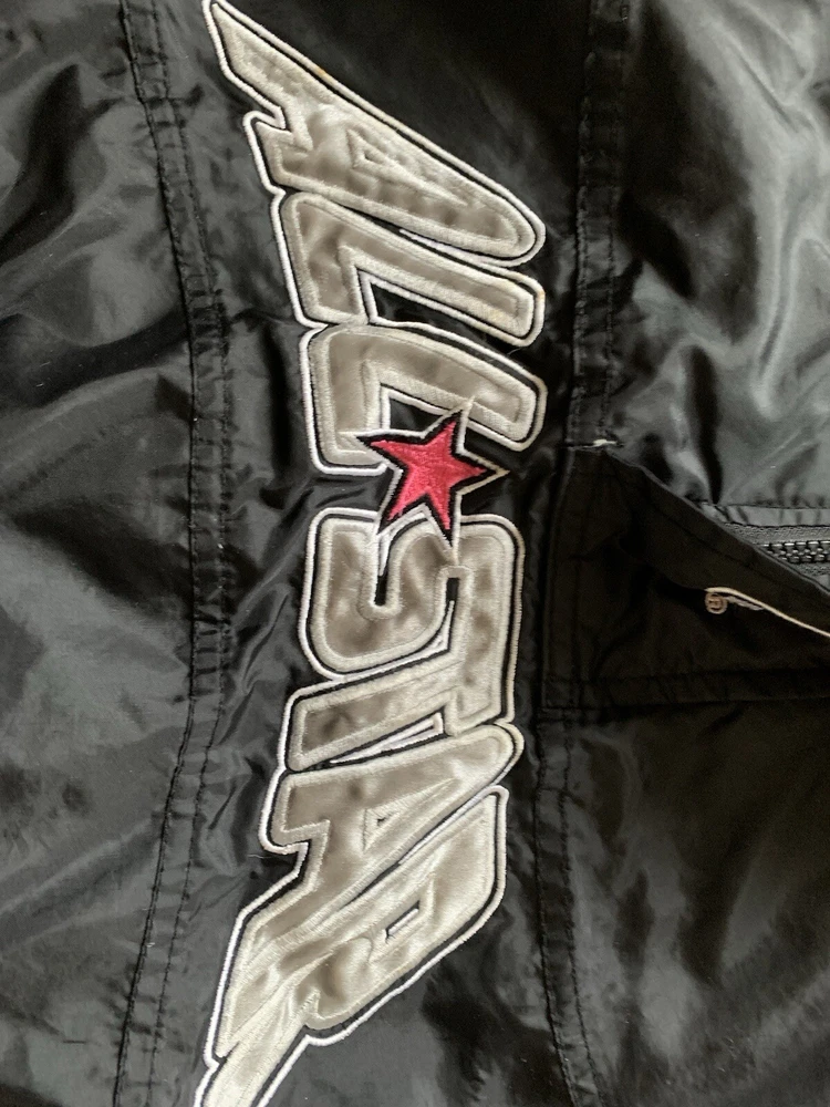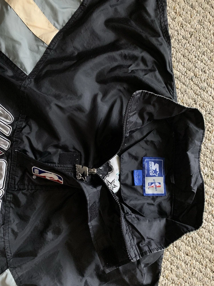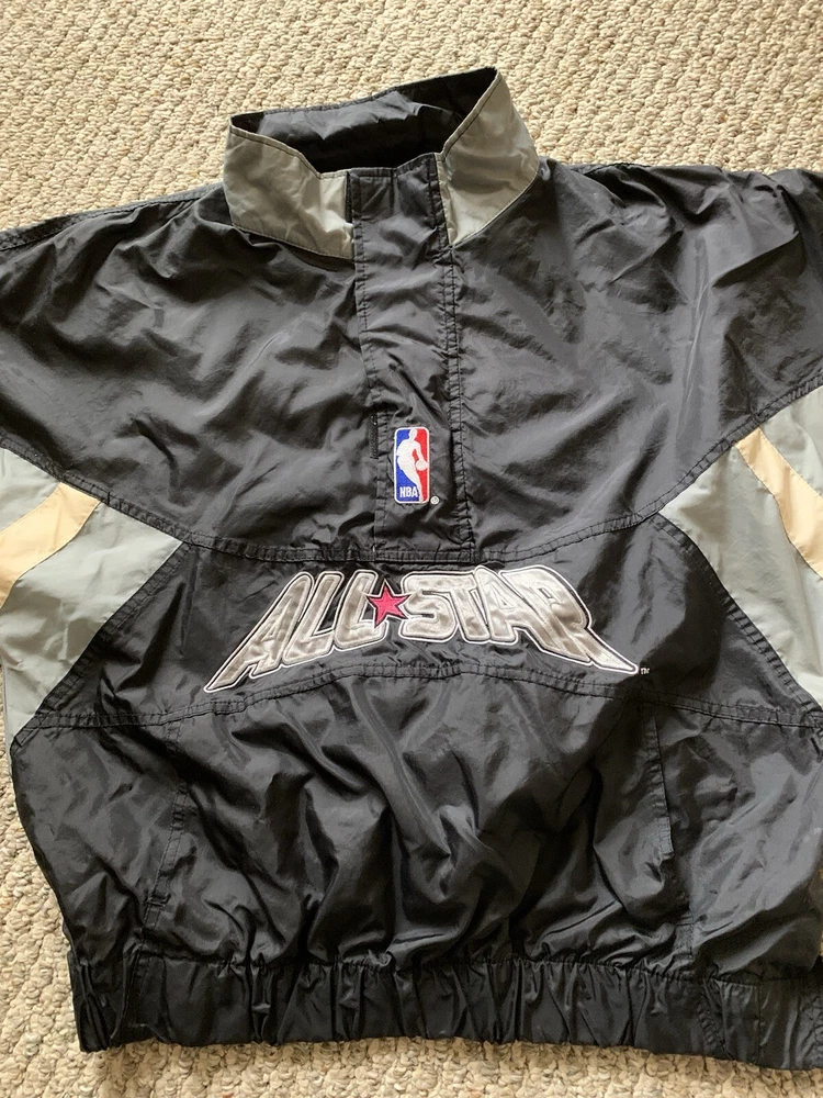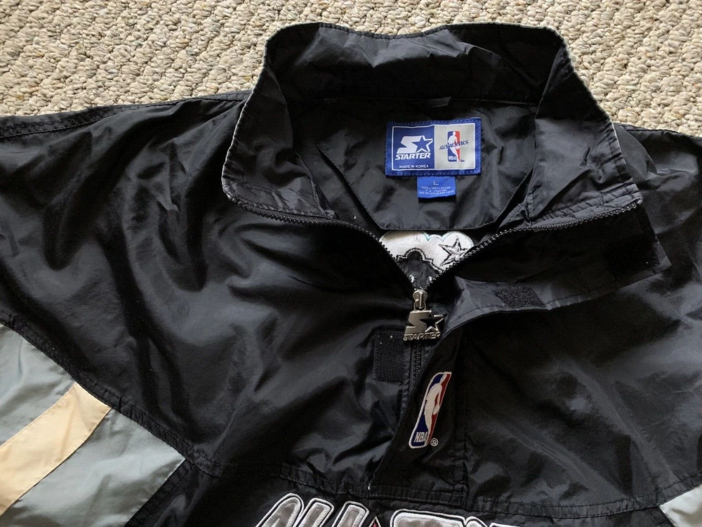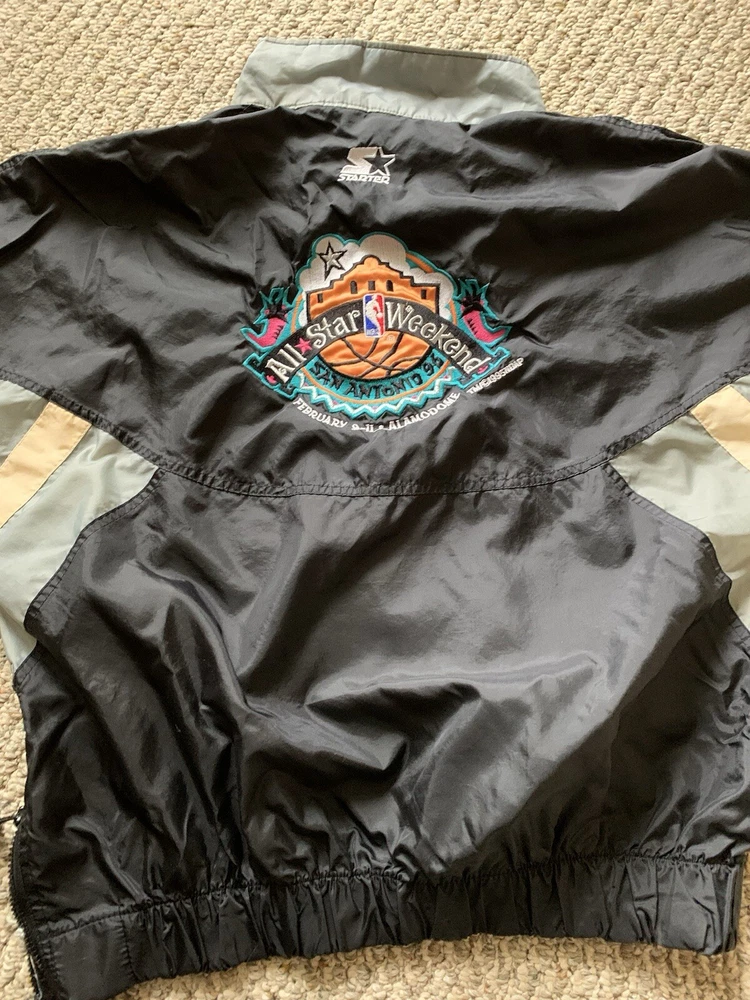 Get ready for the 1996 NBA All Star game with this windbreaker jacket from Starter. The jacket features the logo of the San Antonio Spurs, the team that played in the All-Star Game that year. It is made of high-quality materials to keep you warm and comfortable during the game. The jacket is available in size L and is perfect for any basketball fan who wants to show off their love for the sport.