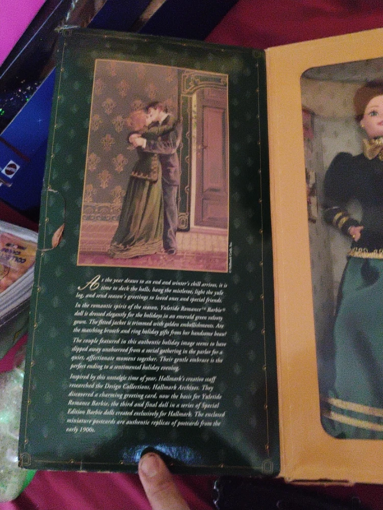 This 1996 Special Edition Hallmark Yuletide Romance Barbie #15621 is a beautiful addition to any doll collection. The doll features a Caucasian complexion, with varying eye and hair colors and types. The doll is 11 1/2 inches tall and 7 inches wide, with a length of 14 inches and a weight of 1.5 lbs. This original, never opened doll is part of the Yuletide Romance product line and is a must-have for any Barbie fan. The doll comes in its original packaging and is a single unit. It is a girl doll and is not personalized or signed. The doll is an original, licensed reproduction from Mattel and was manufactured in China in the 1990s. Box has some damage