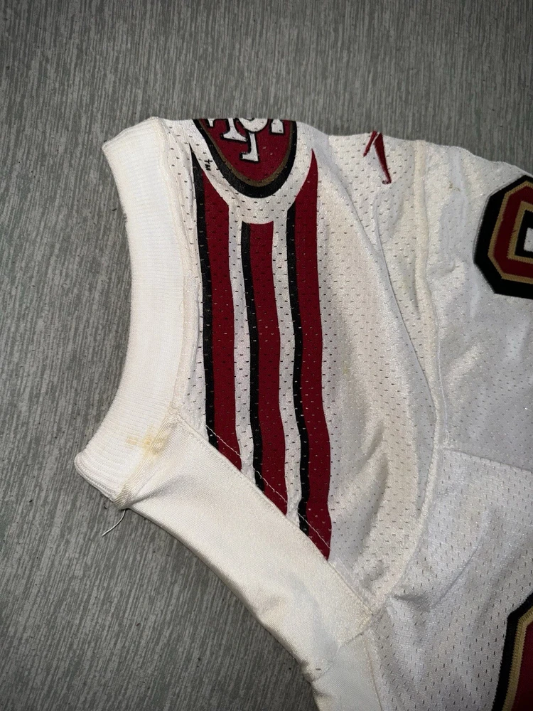 1996-1997 San Francisco 49ers game issued Jerry Rice jersey. Shows a lot of wear on the left sleeve, has signs of wear on right sleeve and neck line as well as individual spots on body. I was not able to find a match to a game with the very limited pictures so I am marking it as just issued. Correct jersey cut and size as seen on Jerry Rice gamers from the 1996 season that were auctioned off by Mears, etc.