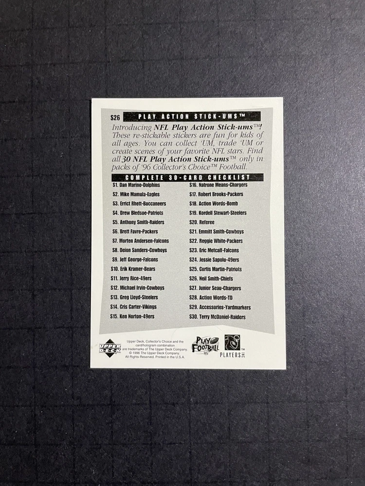 Card Number: S26 Manufacturer: Upper Deck League: National Football League (NFL) Language: English Player/Athlete: Neil Smith Original/Licensed Reprint: Original Sport: Football Country/Region of Manufacture: United States Autographed: No Type: Sports Trading Card Material: Card Stock Features: Parallel/Variety, Insert, Sticker Team: Miami Dolphins, Buffalo Bills, New York Jets, Denver Broncos, New England Patriots, Kansas City Chiefs, Oakland Raiders, San Diego Chargers, Indianapolis Colts, Jacksonville Jaguars, Cincinnati Bengals, Pittsburgh Steelers, Cleveland Browns, Dallas Cowboys, New York Giants, Philadelphia Eagles, Washington Commanders, Tampa Bay Buccaneers, Atlanta Falcons, Carolina Panthers, San Francisco 49ers, Seattle Seahawks, Arizona Cardinals, Los Angeles Rams, Green Bay Packers, Detroit Lions, Minnesota Vikings, Chicago Bears Set: 1996 Upper Deck Collector's Choice Season: 1996 Card Size: Standard