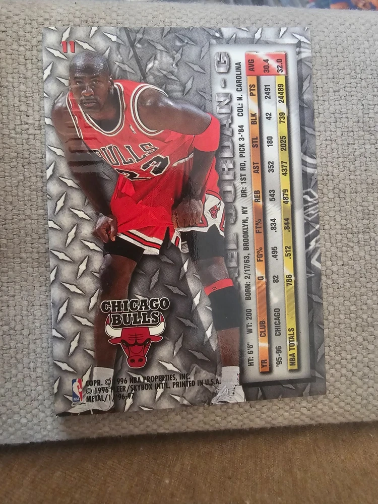 This sports trading card features one of the greatest basketball players of all time, Michael Jordan, in his 1996-97 Fleer Metal edition. The card is made of high-quality metal material and is part of the base set, with card number 11. It is perfect for collectors and fans of the Chicago Bulls team and the National Basketball Association (NBA) league. The 1996-97 Fleer Metal set is manufactured by Fleer/SkyBox International and is a must-have for any sports trading card enthusiast. This card is a great addition to any collection and is sure to impress. Get your hands on this rare and valuable card today!