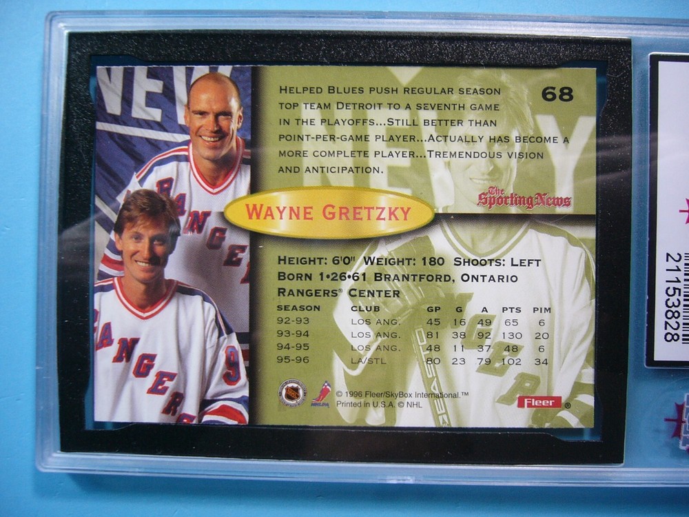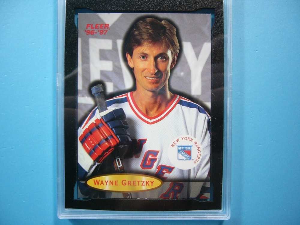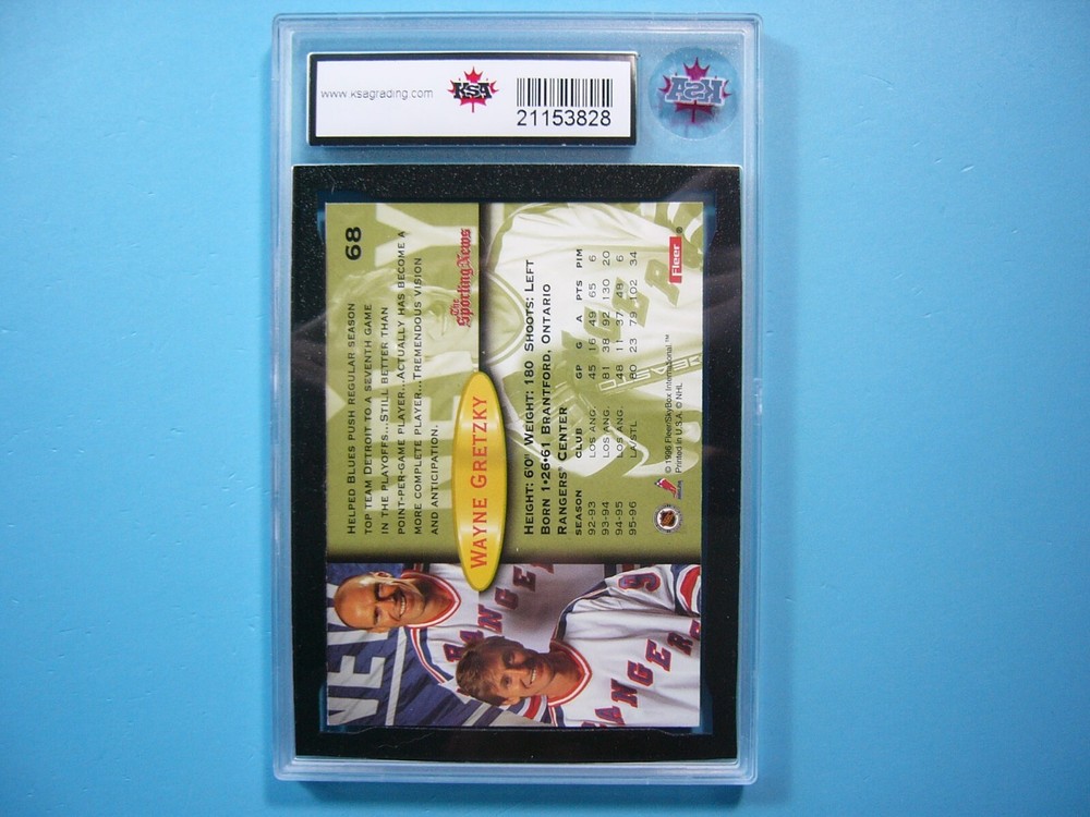 YOU ARE BIDDING ON A 1996/97 FLEER NHL HOCKEY CARD #68 WAYNE GRETZKY, NEW YORK RANGERS. CARD IS GRADED 10 BY KSA IN GEM MINT CONDITION. GREAT COLOUR & GLOSS--A SUPER SHARP, CLEAN & ATTRACTIVE KEY CARD FROM THIS VERY ATTRACTIVE VINTAGE NHL HOCKEY SET!!! THANK YOU FOR LOOKING AND GOOD LUCK!!! -------------------------------------------------------------------------------------------------------------------------------- SHIPPING WITHIN CANADA IS $4.99. SHIPPING TO THE UNITED STATES IS $8.99 AND INCLUDES TRACKING & INSURANCE. SHIPPING INTERNATIONALLY (ANYWHERE ELSE) IS $25.00 AND INCLUDES TRACKING & INSURANCE. ITEM WILL BE CAREFULLY PACKAGED SO AS NOT TO GET DAMAGED DURING SHIPPING. IF YOU ARE IN CANADA AND WOULD LIKE SHIPPING WITH TRACKING & INSURANCE INCLUDED COST IS $12.99. PLEASE CONTACT US BEFORE PAYMENT IS MADE TO ADJUST THE INVOICE ACCORDINGLY. WE DO COMBINE SHIPPING ON MULTIPLE PURCHASES--ONLY $1.00 MORE FOR EACH ADDITIONAL SINGLE GRADED CARD OR ONLY 25 CENTS MORE FOR EACH ADDITIONAL SINGLE UNGRADED CARD. TAKE A LOOK AT OUR OTHER AUCTIONS AND SAVE ON SHIPPING!!!