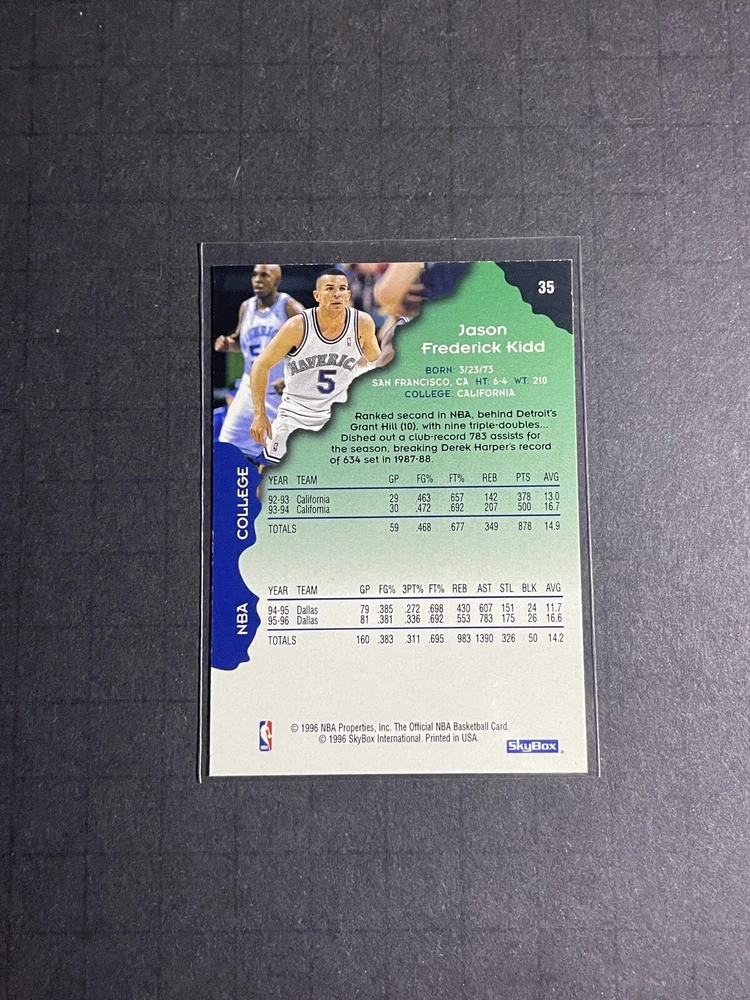 Autograph Authentication: Score Features: Base Set Card Size: Standard Country/Region of Manufacture: United States Material: Card Stock Set: 1996-97 NBA Hoops League: National Basketball Association (NBA) Type: Sports Trading Card Language: English Card Number: 35 Team: Atlanta Hawks, Boston Celtics, Charlotte Hornets, Chicago Bulls, Cleveland Cavaliers, Dallas Mavericks, Denver Nuggets, Duke Blue Devils, Houston Rockets, Los Angeles Clippers, Los Angeles Lakers, Miami Heat, Milwaukee Bucks, New Jersey Nets, New Orleans Hornets, New Orleans Pelicans, Philadelphia 76ers, Phoenix Suns, Sacramento Kings, San Antonio Spurs, Utah Jazz, Washington Bullets Season: 1996-97 Manufacturer: SkyBox Player/Athlete: Jason Kidd Original/Licensed Reprint: Original Sport: Basketball