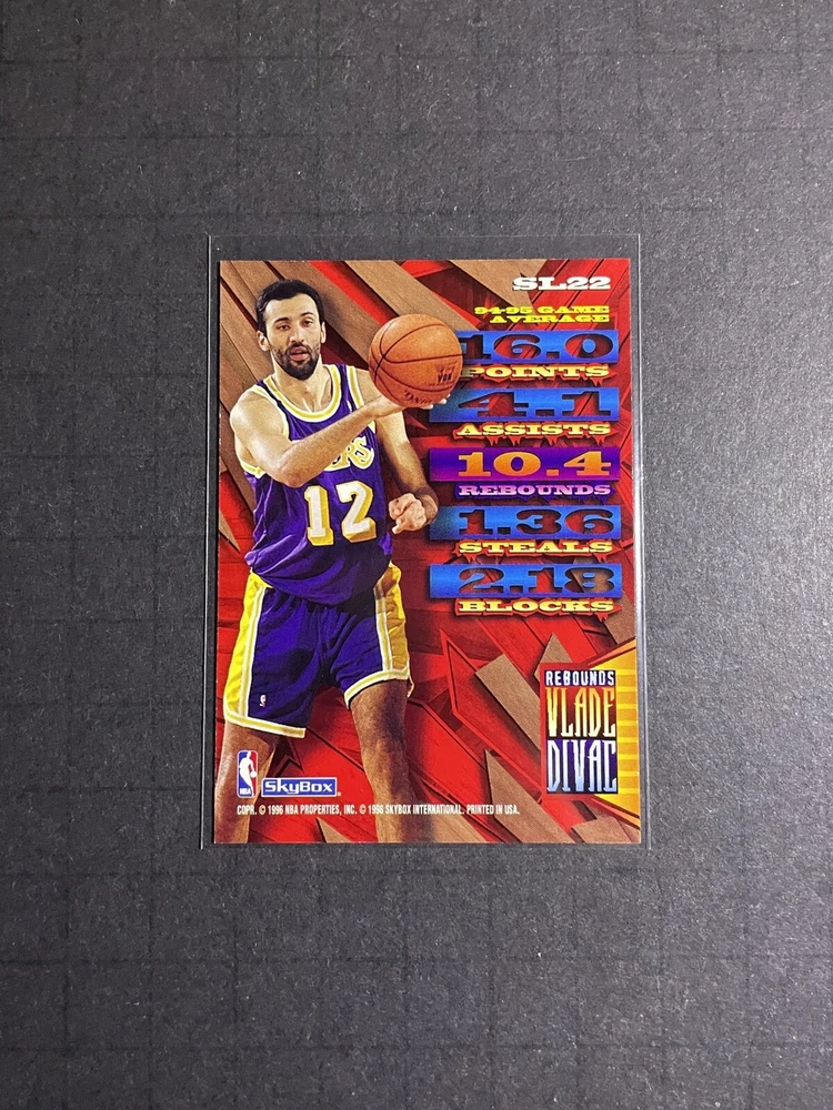 Season: 1996-97 Sport: Basketball Original/Licensed Reprint: Original Manufacturer: SkyBox Player/Athlete: Vlade Divac Country/Region of Manufacture: United States Team: Atlanta Hawks, Boston Celtics, Brooklyn Nets, Charlotte Hornets, Dallas Mavericks, Denver Nuggets, Golden State Warriors, Houston Rockets, Los Angeles Clippers, Los Angeles Lakers, Memphis Grizzlies, Miami Heat, Milwaukee Bucks, Minnesota Timberwolves, New Jersey Nets, New Orleans Hornets, New York Knicks, Oklahoma City Thunder, Orlando Magic, Phoenix Suns, Portland Trail Blazers, Sacramento Kings, San Antonio Spurs, Seattle Supersonics, Toronto Raptors, Utah Jazz, Washington Bullets, Washington Wizards Card Number: SL22 Card Size: Standard Autographed: No Language: English Set: 1996-97 NBA Hoops League: National Basketball Association (NBA) Material: Card Stock Features: Base Set, Insert Type: Sports Trading Card