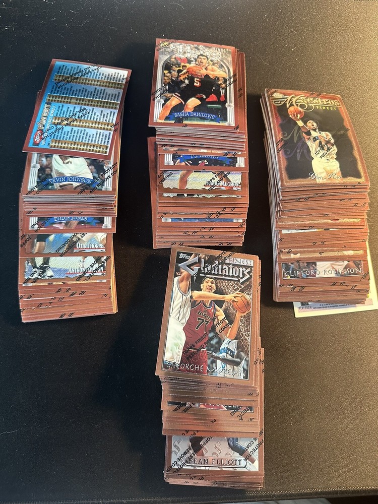 complete 200 card finest bronze series 1 &2 with kobe rc 2- iverson rc ray allen rc jordan marbury rc nash rc includes #136 laettner for card #7 all cards have protective peel