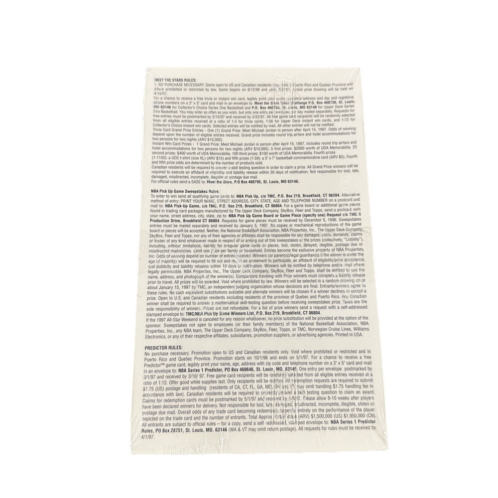 The 1996-97 Upper Deck Series 1 Basketball Factory Sealed Hobby Box contains a set of original basketball trading cards from the 1996-97 season. Manufactured by Upper Deck Series 1, this box offers collectors a chance to find cards featuring players from the NBA in a factory-sealed configuration. Perfect for fans of basketball looking to add to their collection, this hobby box is a nostalgic piece of sports memorabilia that captures the essence of the 1990s basketball era.