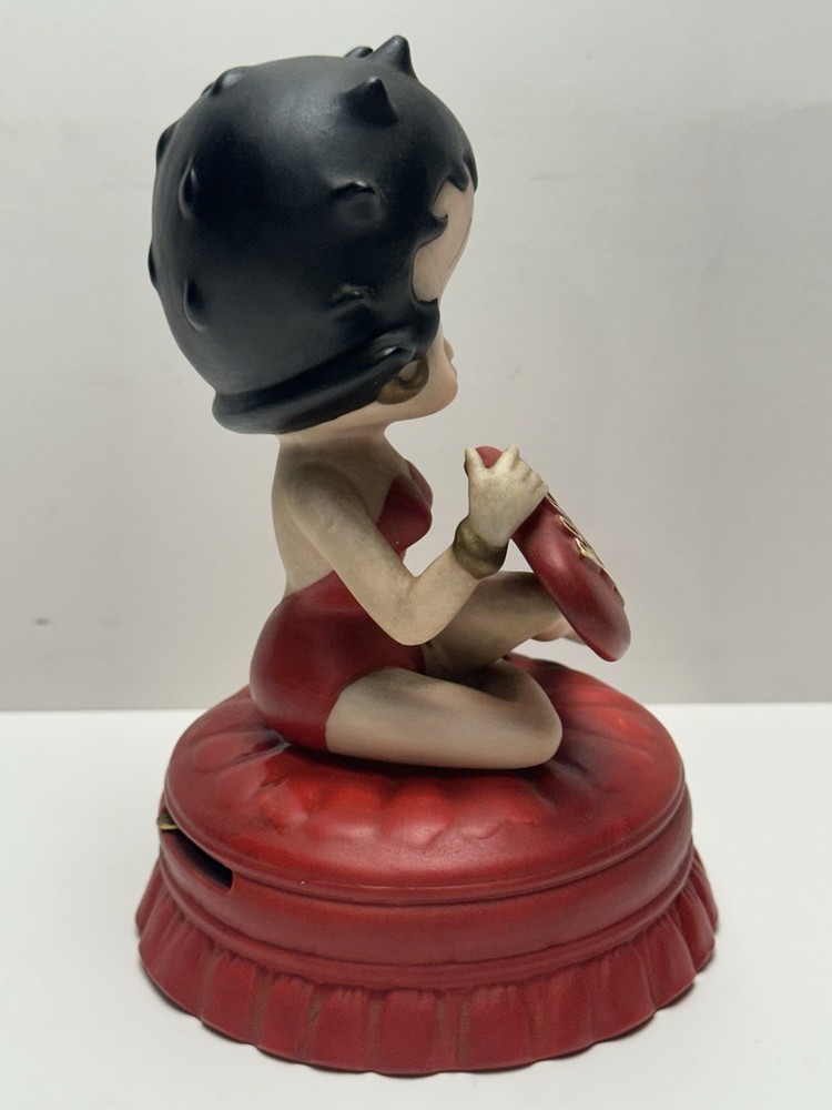 The vintage 1997 Boop Oop-a Doop Betty Boop Heart Theme Musical Figurine is a charming collectible featuring the iconic animated character Betty Boop. Created by The San Francisco Music Box Company, this ceramic figurine stands at 5.5 inches tall and plays a delightful musical tune. With a Valentine Heart theme and a wind-up feature, this nostalgic piece from 1997 is a perfect addition to any animation or Betty Boop memorabilia collection. Made in Sri Lanka, this unique item offers a glimpse into the world of classic animation and musical toys.