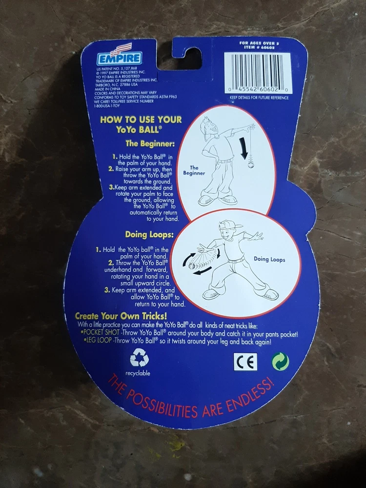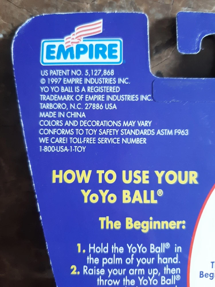 This yo-yo ball from EMPIRE INDUSTRIES is a classic toy that will bring hours of fun for both boys and girls. Made in 1997, it retains its vintage charm and is brand new, waiting for someone to give it a spin. The sleek and stylish design of the yo-yo ball is perfect for collectors and those looking for a unique addition to their toy collection. With its durable construction and smooth performance, it's sure to impress even the most experienced yo-yo players. A-3