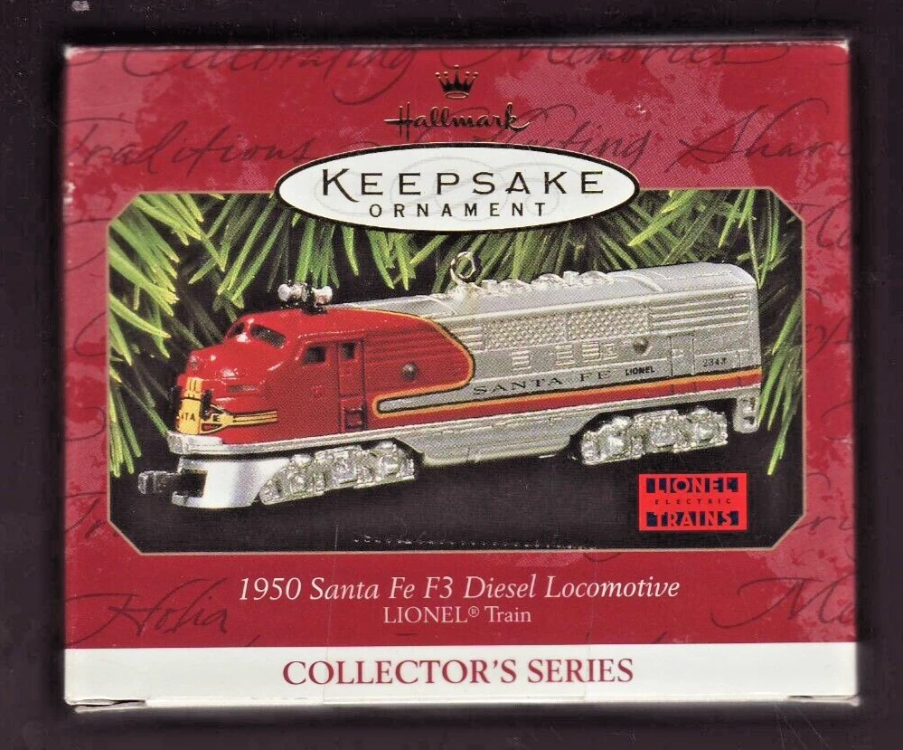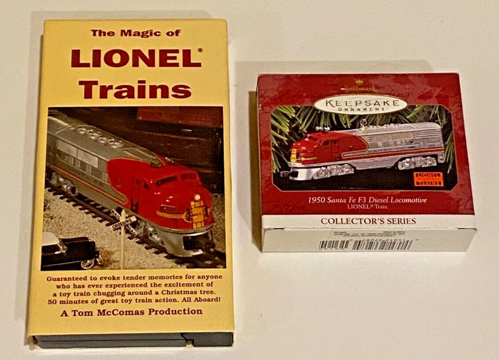 1997 Hallmark 1950 SANTA FE DIESEL LOCOMOTIVE Ornament + LIONEL TRAINS VHS