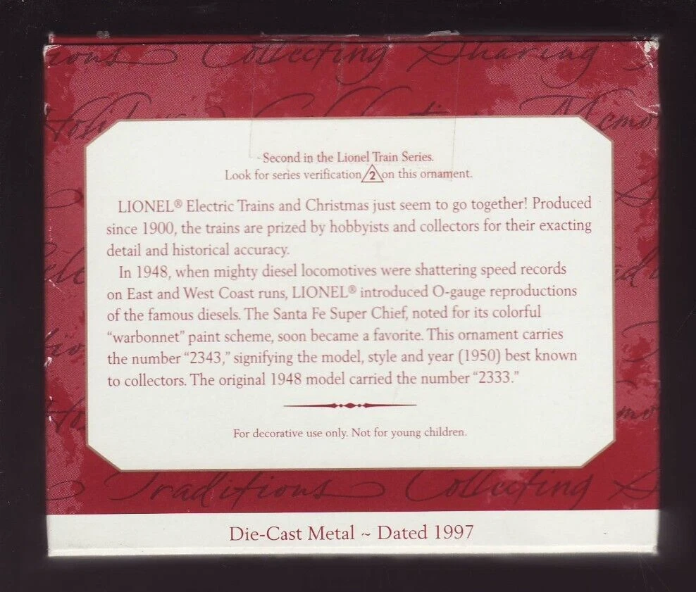 1997 Hallmark Keepsake Ornament. . 1950 SANTA FE F3 DIESEL LOCOMOTIVE. also included is the 1993 VHS tape THE MAGIC OF LIONEL TRAINS 1993 VHS. The ornament is the 2nd in the series. This is one of the longest runs at Hallmark, this year was the 29th in the series. The box has some light wear, There is some clear tape on the top and bottom of the box and a small ding on the back upper right. but the ornament looks like new with what appears to be original packing,. The price tag is attached and the retail was $18.95.......Made of DIE CAST METAL. The VHS tape is in excellent condition, the case has very little wear, the tape looks almost new, maybe never played. A great combo for the Train lovers in the world!! From a smoke free environment. Will be wrapped and padded in bubble wrap and/or popcorn then shipped in a solid box with full tracking. .....See my store for other Hallmark specials, From the 1980's forward, email with questions, I do combine shipping,.... For multiple purchases please use your "CART" then hit the "REQUEST TOTAL FROM SELLER" tab and I will send you an invoice.