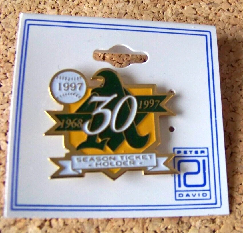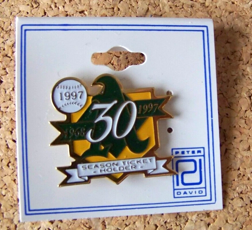 1997 Oakland Athletics A's Season Ticket holder pin 30th Anniversary Item Description: Type: MLB licensed, gold tone, post and butterfly clip backed, lapel / hat pin Size: measures about 1.2" wide Condition: Light wear, small nicks, scuffs. Packaging: on backing card Packaging condition: excellent minor nicks in backing card Shipping: Shipping Time : 1 business day of receiving cleared payment, Mondays thru Fridays. U.S.A. Shipping Costs: FREE! Return Policy: Returns accepted, buyer pays return shipping unless there’s an error on seller’s part. Additional Information: Full e-mail support for inquiries or problems. HIGH COUNTRY COLLECTIBLES Since 1989 – A LEADER IN THE DENVER SPORTS MEMORABILIA MARKET. Check out my other auctions and listings, and keep an eye out for the different, unusual, and EXCLUSIVE items available nowhere else but from High Country Collectibles. Don’t forget to click on my "Stores" link, next to my eBay name, to see other items I currently have listed for sale, or you can copy and paste this address into your browser: stores.ebay.com/highcountrycollectibles