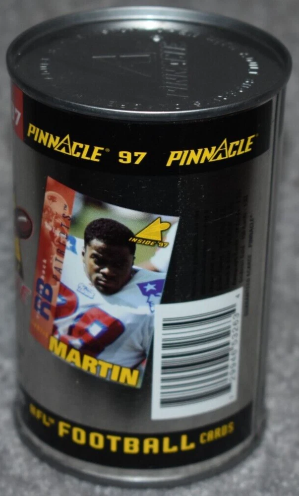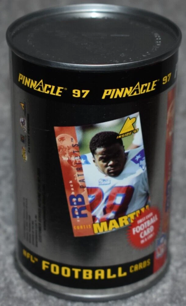 THIS IS A LISTING FOR 1997 PINNACLE INSIDE CARDS IN A CAN. CONTAINS 1 PACK OF CARDS WITH TEN CARDS IN THE PACK. THE CAN PICTURES NEW ENGLAND PATRIOTS CURTIS MARTIN. IT IS NOT OPENED. IT MAY/HAS SLIGHT MARK/MARKS ON TOP/SIDES OF THE CAN AS PICTURE SHOWS. IF YOU HAVE ANY QUESTIONS PLEASE CONTACT ME BEFORE PURCHASEING THE ITEM. GREAT COLLECTORS ITEM. I ACCEPT EBAY ONLINE PAYMENTS AND PAYPAL. MOST ORDERS ARE SHIPPED IN ONE BUSINESS DAY. THANKS FOR LOOKING AND HAVE A GREAT DAY. On Sep-18-02 at 02:56:00 PDT, seller added the following information: After purchasing, pay instantly with your credit card through PayPal!