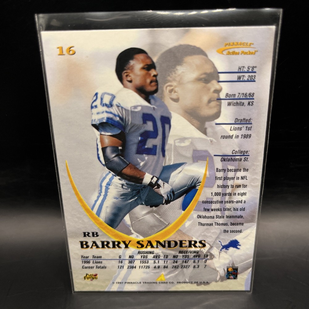 1997 Pinnacle Action Packed Barry Sanders #16 Detroit Lions trading card is a must-have. The card is an original, ungraded, and in excellent condition. The standard-sized card features a stunning image of Barry Sanders, the celebrated player from the National Football League (NFL) who played for the Detroit Lions and the Oklahoma State Cowboys. This sports trading card is a part of the 1997 Pinnacle Action Packed set and has a parallel design. The card number is 16, and it is officially licensed and manufactured by Pinnacle. It is a perfect addition to any collection of trading card singles.