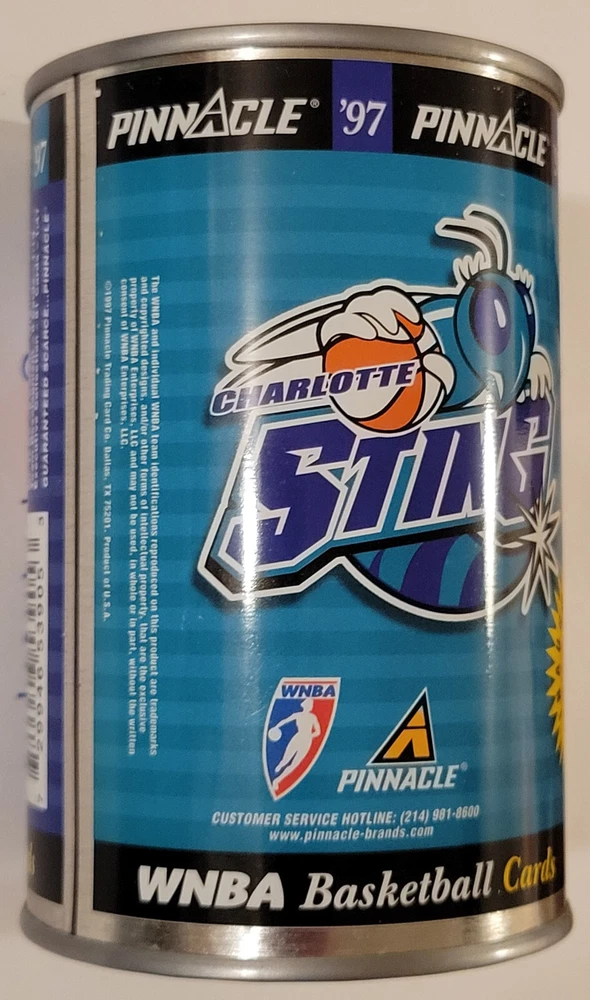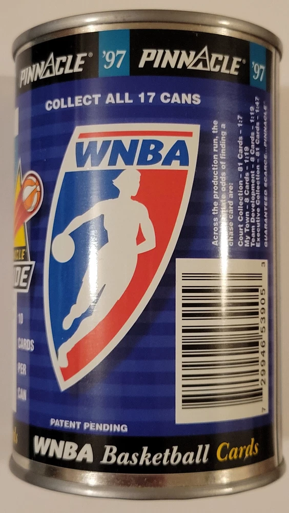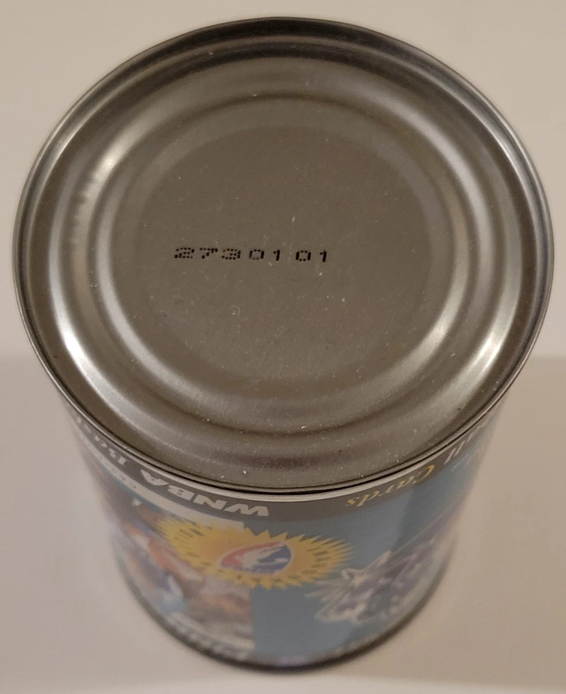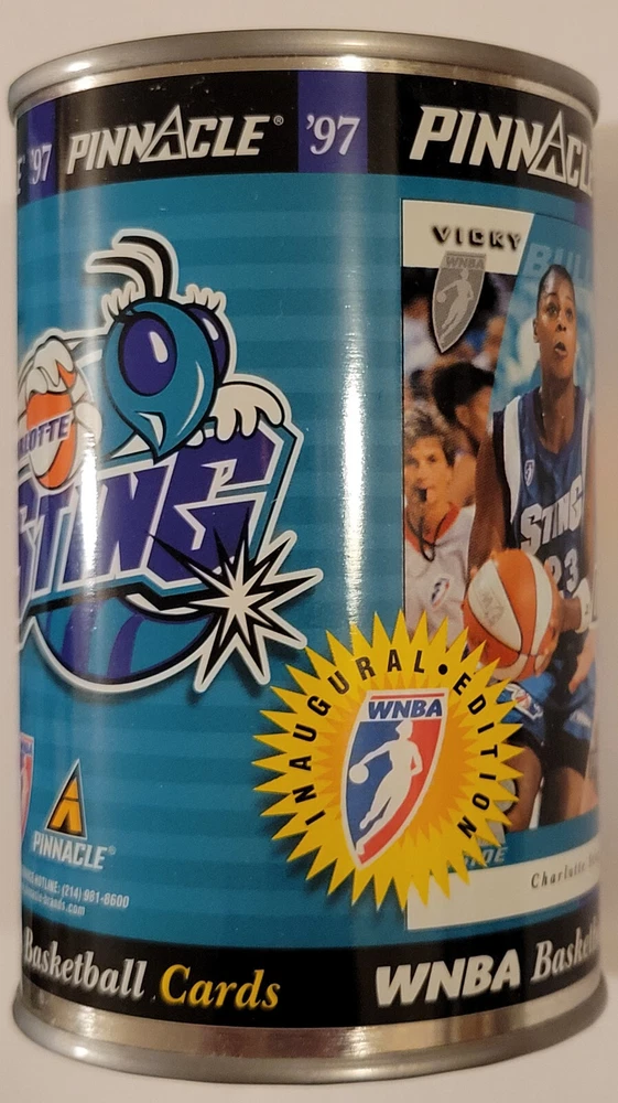 This listing is for the hard to find 1997 Pinnacle Inside WNBA Sealed Can featuring the Vicky Bullett rookie card image with a sealed pack of 10 cards inside it as pictured above. These vacuum sealed steel cans are extremely colorful as can be seen in the photos and are rarely found sealed with the 10 card pack. They are from the original first series release and are not found very often as supplies have dried up! This can is approximately 4 1/2" tall, almost 3" in diameter, is in great condition with only very minor signs of wear (possible light scratches or dents), and has no rust as is often found on these over 25 year old collectibles! If you were to decide to open the can and then the inner pack, the odds for the different inserts are; Court Collection (81 cards) 1:7 packs, Executive Collection (81 cards) 1:47 packs, My Town (8 cards) 1:19 packs, and Team Development (8 cards) 1:19 packs Any odd reflection spots or color patterns in the images are likely from the camera. Domestic shipping will be free. International bidders please email us for a shipping quote. We do accept eBay payments. If you are an international bidder, we may require that you pay for insured USPS Global Priority Mail for this item so that there will be a tracking number and full protection. Please take a look at our other items available for sale. If you have any questions at all, please feel free to email us.