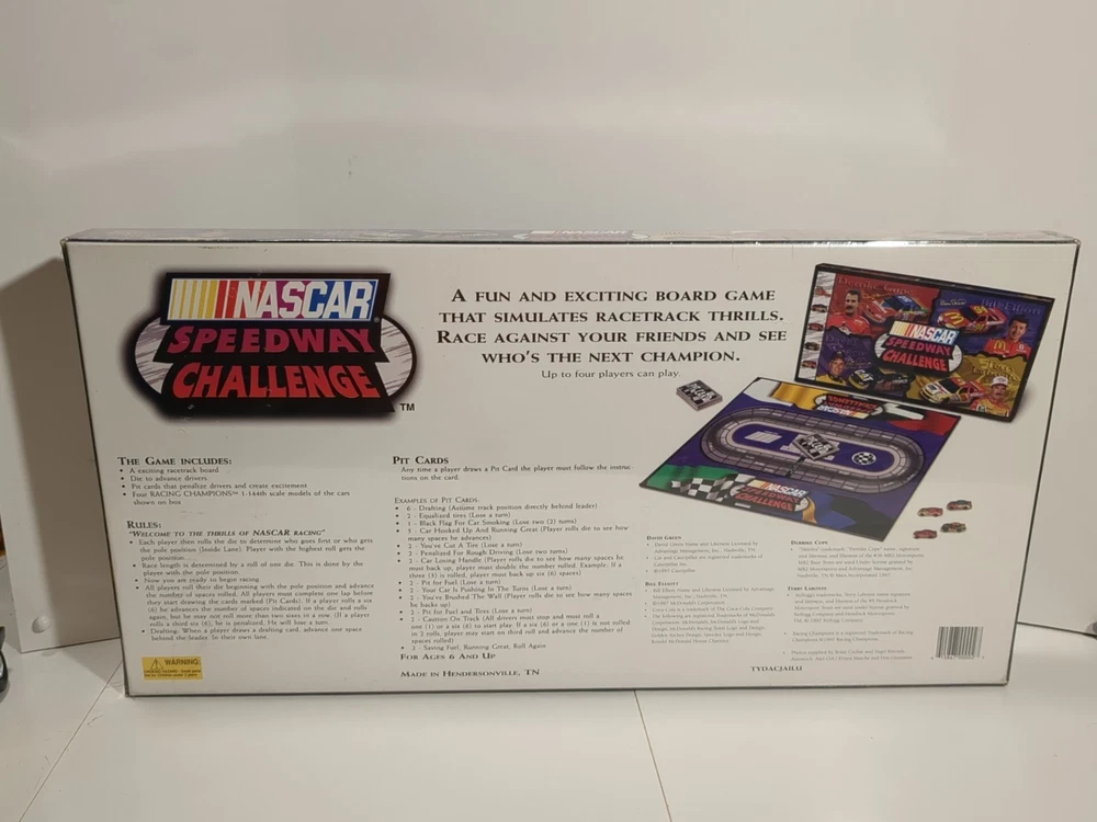 Experience the thrill of NASCAR with this sealed board game from 1997. Featuring a replica of Bill Elliott's 1:144th scale diecast car, this officially licensed product is perfect for any fan of the sport. The multi-color game includes everything you need to challenge your friends and family to a race, with rules that are easy to learn but hard to master. Whether you're a fan of Hendrick Motorsports or just love the excitement of NASCAR, this board game is sure to provide hours of entertainment. So gather your crew, grab some snacks, and get ready to race! See pics for condition