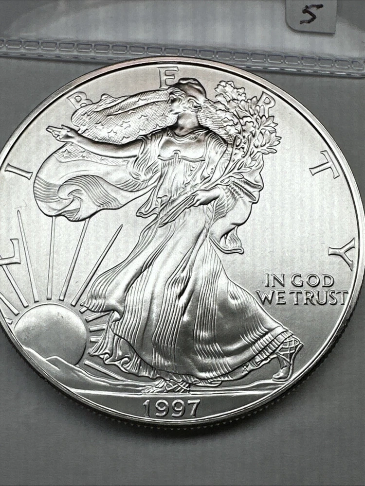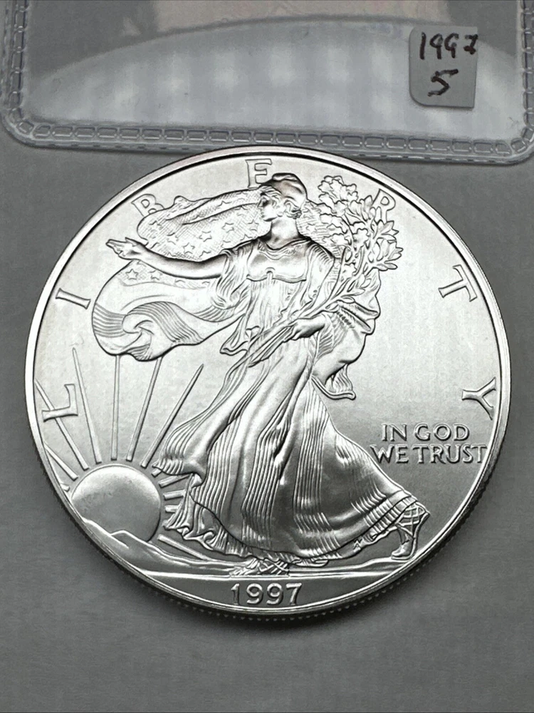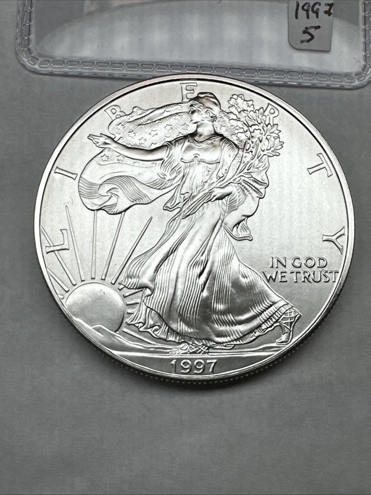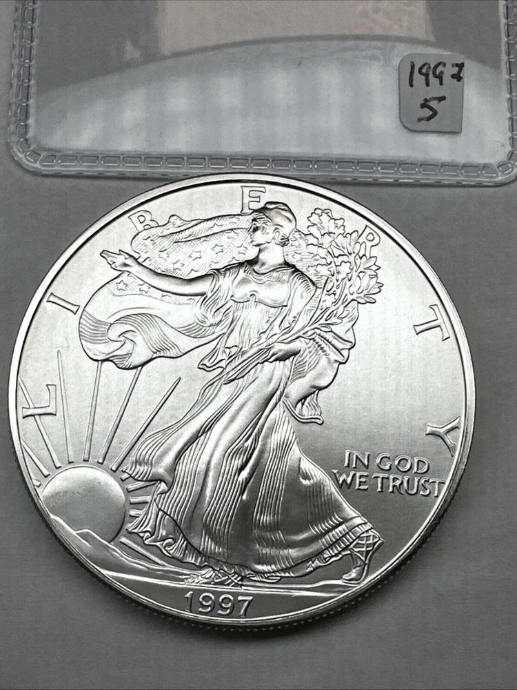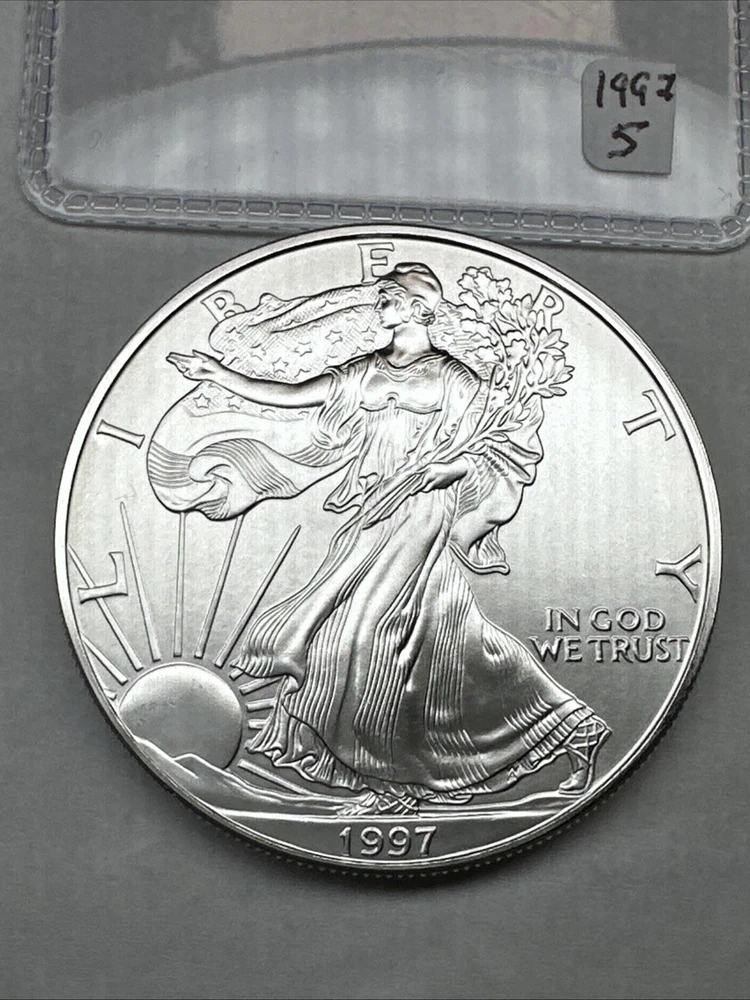 Strike Type: Business Fineness: 0.999 Precious Metal Content per Unit: 1 oz Grade: Ungraded Year: 1997 Country/Region of Manufacture: United States Certification: Uncertified Total Precious Metal Content: 1 oz Coin: American Eagle Brand/Mint: U.S. Mint Composition: Silver