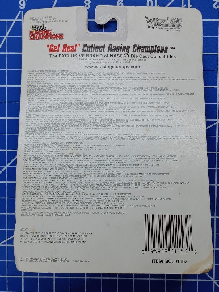 Vehicle Type: NASCAR Racecar Vehicle Year: 1997 Series: Racing Champions Character Family: Nascar Driver: Terry Labonte gtin13: 095949011538 Material: Diecast Scale: 1:64 Model: Monte Carlo Color: Blue Organization: NASCAR Vehicle Make: Chevrolet Brand: Racing Champions UPC: 095949011538