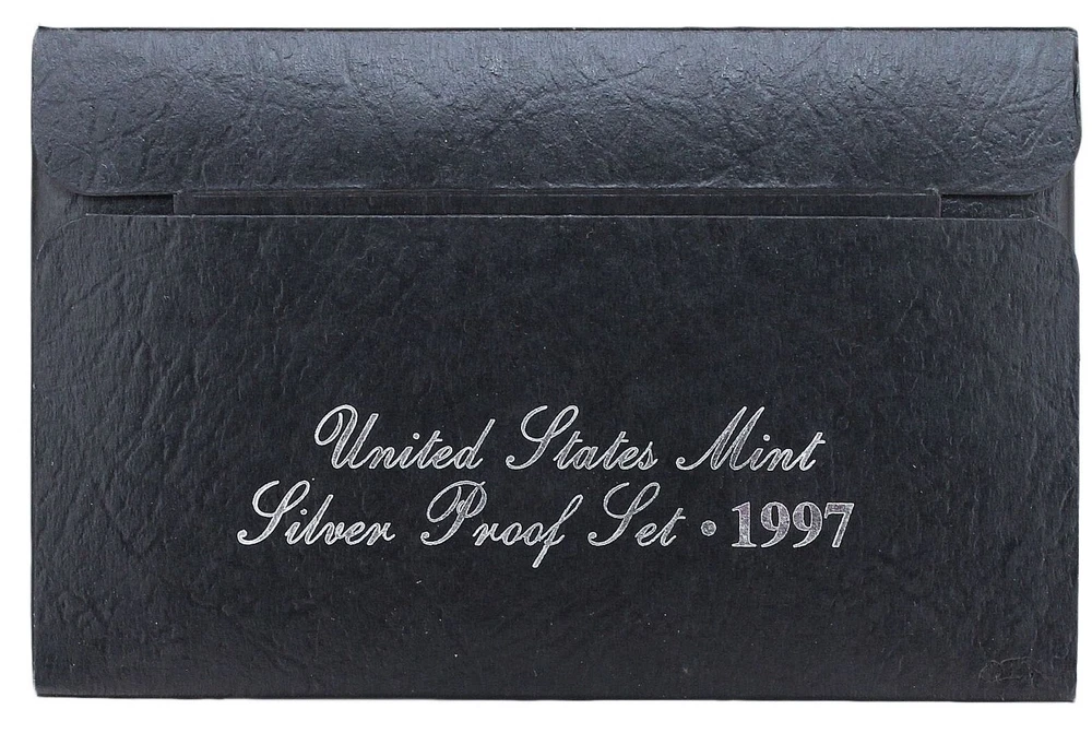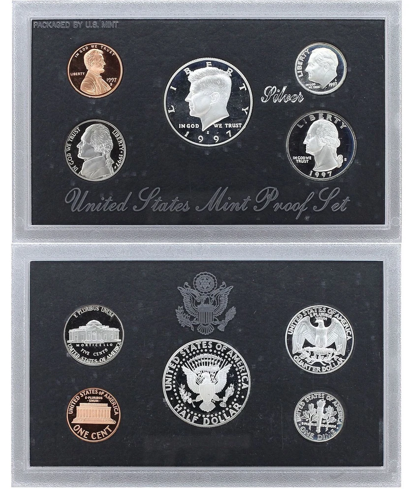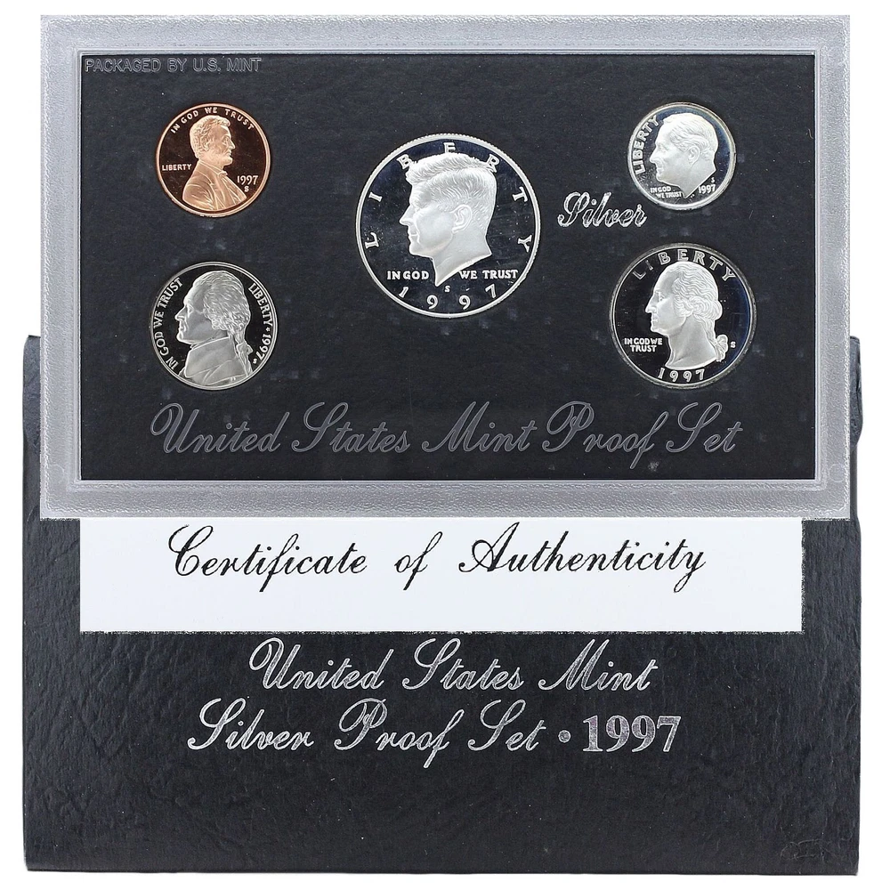 1997 United States Mint Silver Proof Set - 5 Coins - COA & OGP 90% Silver This 1997 Silver Proof Set contains 5 proof condition coins. This set contains the Lincoln Cent, Jefferson Nickel, Roosevelt Dime, Washington Quarter and Kennedy Half Dollar. The dime, quarter and half dollar are minted in 90% pure silver. This 1995 Silver Proof Set comes in like new condition, sealed in its plastic display case with a black background as packaged by the U.S. Mint, and includes the original Mint black cardboard envelope and Certificate of Authenticity.