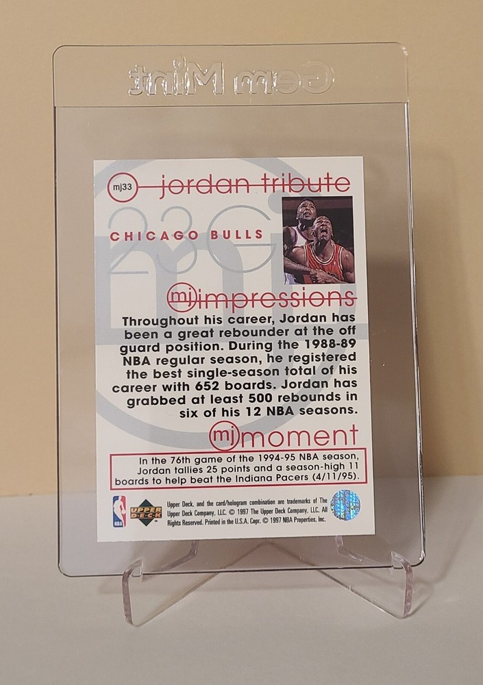 The product is a 1996 Upper Deck Michael Jordan Tribute card from the MJ Impressions insert set, featuring the Chicago Bulls NBA legend. This card, numbered MJ33, is a part of the 1996-97 season collection and is a parallel variety of the main Jordan Tribute card, showcasing a unique design. It is a sought-after sports trading card for fans and collectors of basketball memorabilia, manufactured by Upper Deck to honor Jordan's achievements in the sport.
