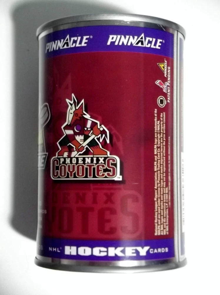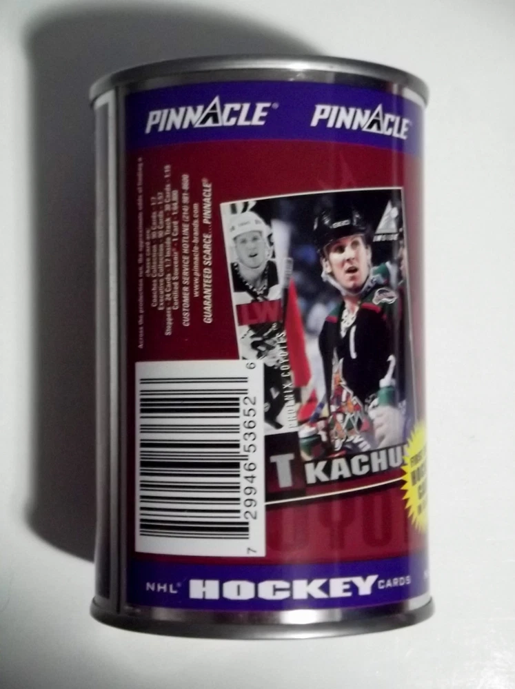 This listing is for the hard to find 1997-98 Pinnacle Inside Sealed Can featuring Keith Tkachuk with a sealed pack of 10 cards inside it as pictured above. These vacuum sealed steel cans are extremely colorful as can be seen in the photos and are rarely found sealed with the 10 card pack. They are from the original first series release and are not found very often as supplies have dried up! This can is approximately 4 1/2" tall, almost 3" in diameter, is in great condition with only very minor signs of wear, and has no rust as is often found on these over 20 year old collectibles! If you were to decide to open the can and then the inner pack, the odds for the different inserts are; Coaches Collection (90 Cards) 1:7 packs, Executive Collection (90 Cards) 1:47 packs, Stoppers (24 Cards) 1:7 packs, Inside Track (30 Cards) 1:19 packs, and 1 Certified Souvenir card 1:64,800 packs. Please note that the nearly impossible to find Certified Souvenir card would probably be a redemption card which expired a long time ago. Any spots or odd color patterns in the images are likely from the camera. Domestic shipping will be free. International bidders please email us for a shipping quote. We do accept eBay payments. If you are an international bidder, we may require that you pay for insured USPS Global Priority Mail for this item so that there will be a tracking number and full protection. Please take a look at our other items available for sale. If you have any questions at all, please feel free to email us.