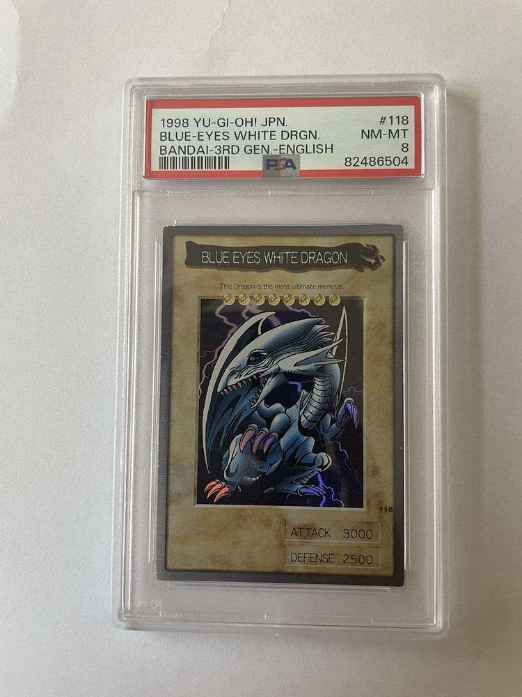 Elevate your Yu-Gi-Oh! TCG collection with the iconic Blue-Eyes White Dragon card, a staple from the Bandai set. This particular card is a third-generation print from 1998, boasting a PSA grade of 8, ensuring its quality and authenticity. A must-have for serious collectors and duelists, the card features stunning full art with a holographic finish that captures the essence of this powerful Basic Stage creature. The Blue-Eyes White Dragon card is secret rare, language-English, and comes from a time when cards were manufactured in Japan. It's a true vintage piece, reflecting the early days of the Yu-Gi-Oh! trading card game. Please note that this is not an autographed item, and the card size is standard. Add this legendary creature to your collection and enjoy the prestige it brings to your game. This comes with both blue eyes white dragon psa 8 Bandai cards.The serial numbers are 82486504 and 82486505.