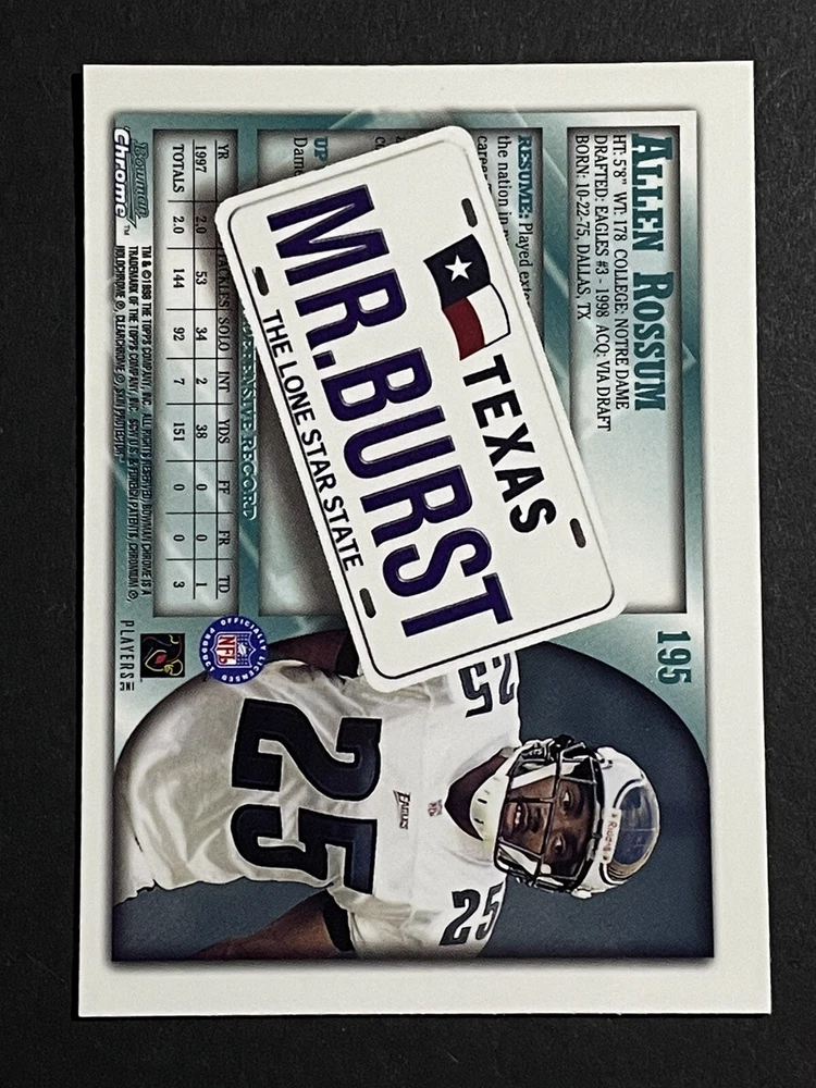 Player/Athlete: Allen Rossum Material: Card Stock Country/Region of Manufacture: United States Sport: Football Season: 1998 Autographed: No Team: Miami Dolphins, Buffalo Bills, New York Jets, Denver Broncos, New England Patriots, Kansas City Chiefs, Oakland Raiders, San Diego Chargers, Indianapolis Colts, Jacksonville Jaguars, Cincinnati Bengals, Pittsburgh Steelers, Cleveland Browns, Dallas Cowboys, New York Giants, Philadelphia Eagles, Washington Commanders, Tampa Bay Buccaneers, Atlanta Falcons, Carolina Panthers, San Francisco 49ers, Seattle Seahawks, Arizona Cardinals, Los Angeles Rams, Green Bay Packers, Detroit Lions, Minnesota Vikings, Chicago Bears Original/Licensed Reprint: Original Manufacturer: Topps Features: Insert, Rookie League: National Football League (NFL) Language: English Card Size: Standard Type: Sports Trading Card Set: 1998 Bowman Chrome