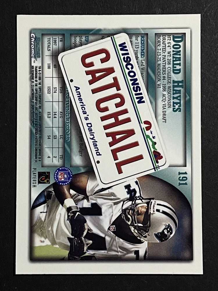 Card Size: Standard Autographed: No Set: 1998 Bowman Chrome Features: Insert, Rookie Team: Miami Dolphins, Buffalo Bills, New York Jets, Denver Broncos, New England Patriots, Kansas City Chiefs, Oakland Raiders, San Diego Chargers, Indianapolis Colts, Jacksonville Jaguars, Cincinnati Bengals, Pittsburgh Steelers, Cleveland Browns, Dallas Cowboys, New York Giants, Philadelphia Eagles, Washington Commanders, Tampa Bay Buccaneers, Atlanta Falcons, Carolina Panthers, San Francisco 49ers, Seattle Seahawks, Arizona Cardinals, Los Angeles Rams, Green Bay Packers, Detroit Lions, Minnesota Vikings, Chicago Bears Player/Athlete: Donald Hayes Material: Card Stock Manufacturer: Topps Type: Sports Trading Card Original/Licensed Reprint: Original Country/Region of Manufacture: United States League: National Football League (NFL) Sport: Football Language: English Season: 1998
