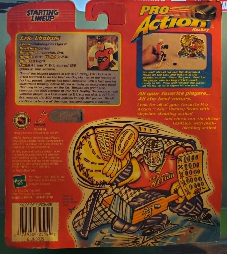 This 1998 Eric Lindros Starting Lineup Pro Action NHL Philadelphia Flyers figure is a must-have for any Flyers fan.