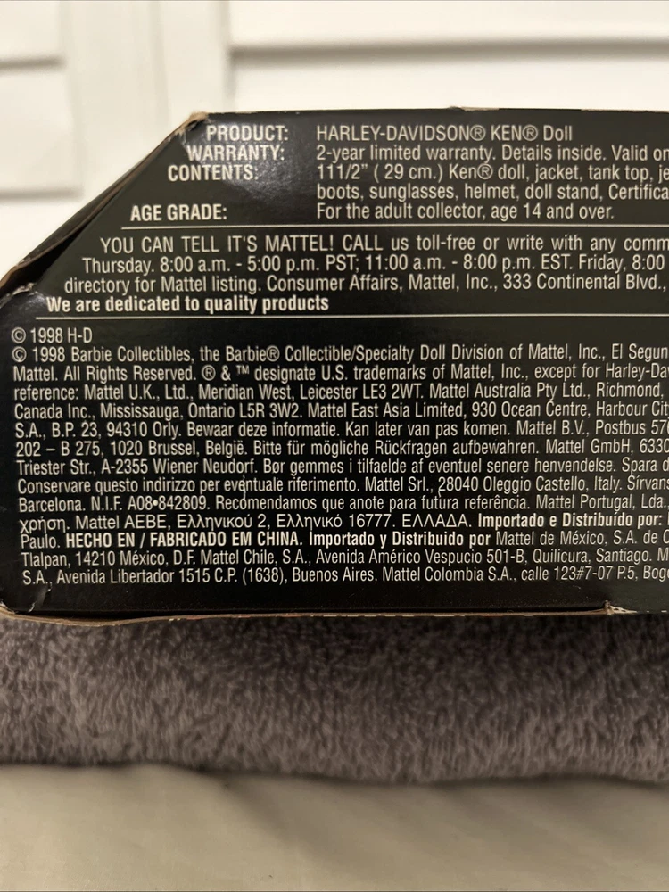 Number of Pieces: 2 Doll Eye Color: Blue Features: Collector Edition, Collector Toy Franchise: Barbie Set Includes: Doll Doll Age Group: 14+ Brand: Mattel Doll Size: 12 in Character: Ken Original/Licensed Reproduction: Licensed Reproduction Material: Plastic, Fabric, Vinyl Item Weight: 2 lb Type: Fashion Doll Occasion: All Occasions Year Manufactured: 1998 Country/Region of Manufacture: China And Indonesia Packaging: Original (Unopened) Doll Complexion: Medium Doll Hair Color: Dark Brown Product Line: Harley-Davidson Doll Hair Type: Straight Vintage: Yes Unit of Sale: Single Unit Time Period Manufactured: 1990-1999 Doll Gender: Boy Doll