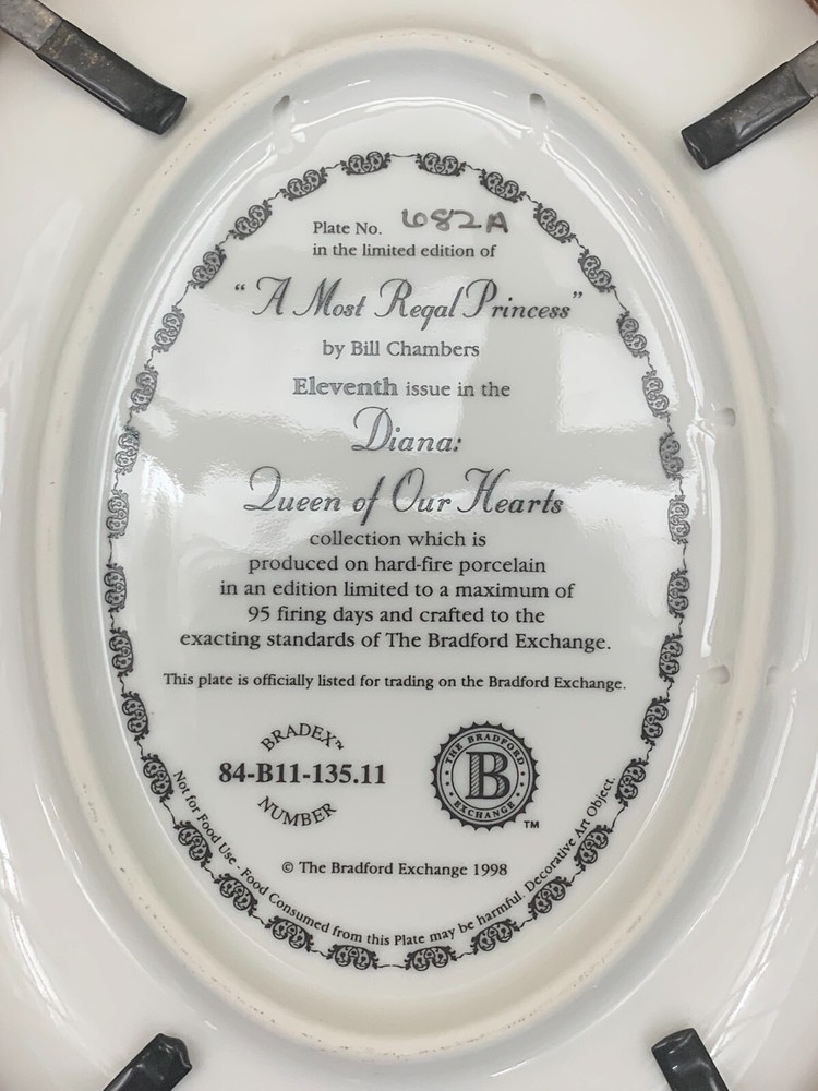 Plate # 682 A "A Most Regal Princess" by Bill Chambers Eleventh issue in Diana: Queen of Our Hearts 1998, Bradford Exchange. Oval porcelain plate is in a wood frame with gold edging. A few tiny flaws on wood and gold, Diana is in pristine shape. Measures 9" x 11 1/2" x 1 1/4" Fast shipping, quality packed, smoke-free household, trackable. Thanks for looking :)
