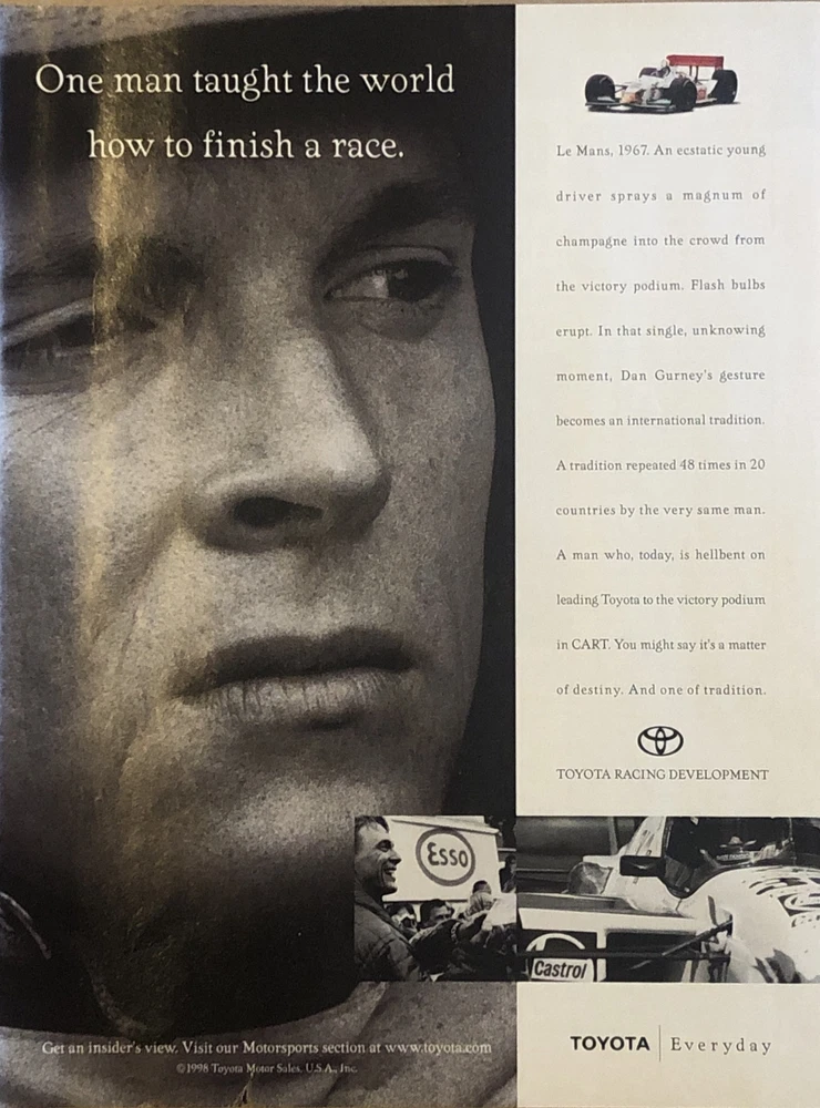 Take a trip down memory lane with this vintage 1990s Toyota Racing Print Ad featuring racing legend Dan Gurney at the 1967 Le Mans race. The black and white ad showcases the iconic Toyota racing car with a champagne spray in the air, capturing the excitement and thrill of the race. The ad is an original piece from 1998, making it a rare find for collectors who appreciate the history and legacy of Toyota's racing heritage. The ad is perfect for fans of automobile racing and Toyota enthusiasts who want to add a unique piece to their collection. The ad is a magazine print ad and is in good condition. Get your hands on this original piece of Toyota history and relive the glory days of racing with Dan Gurney and the iconic Toyota racing car. Original approximate 8”x11” vintage magazine print ad.