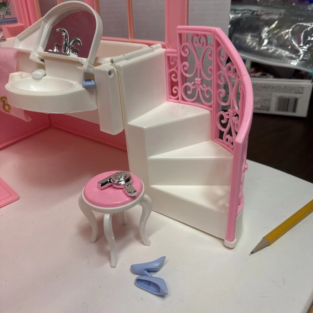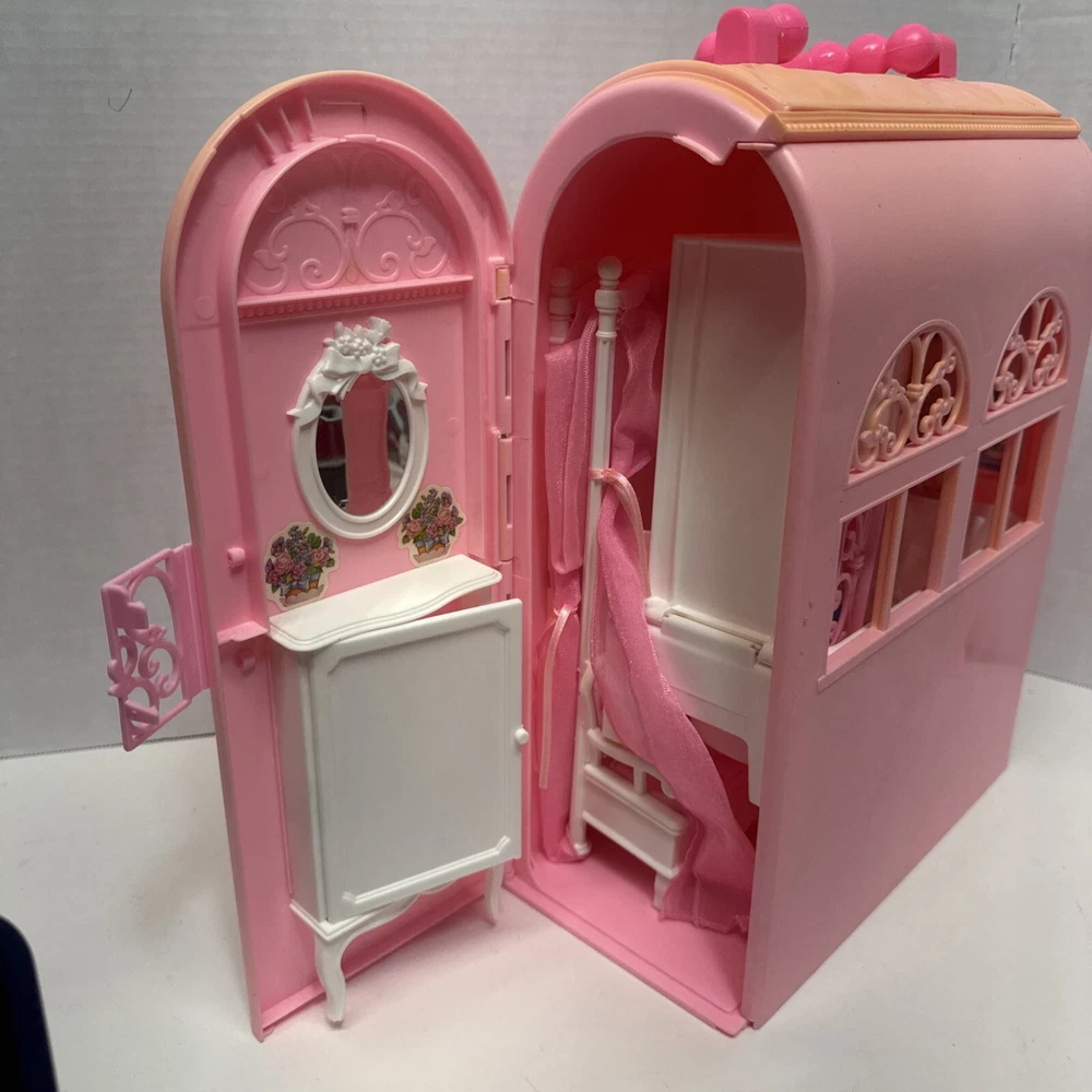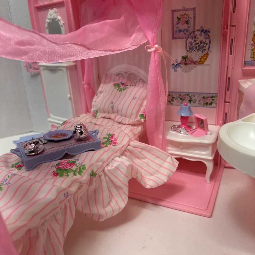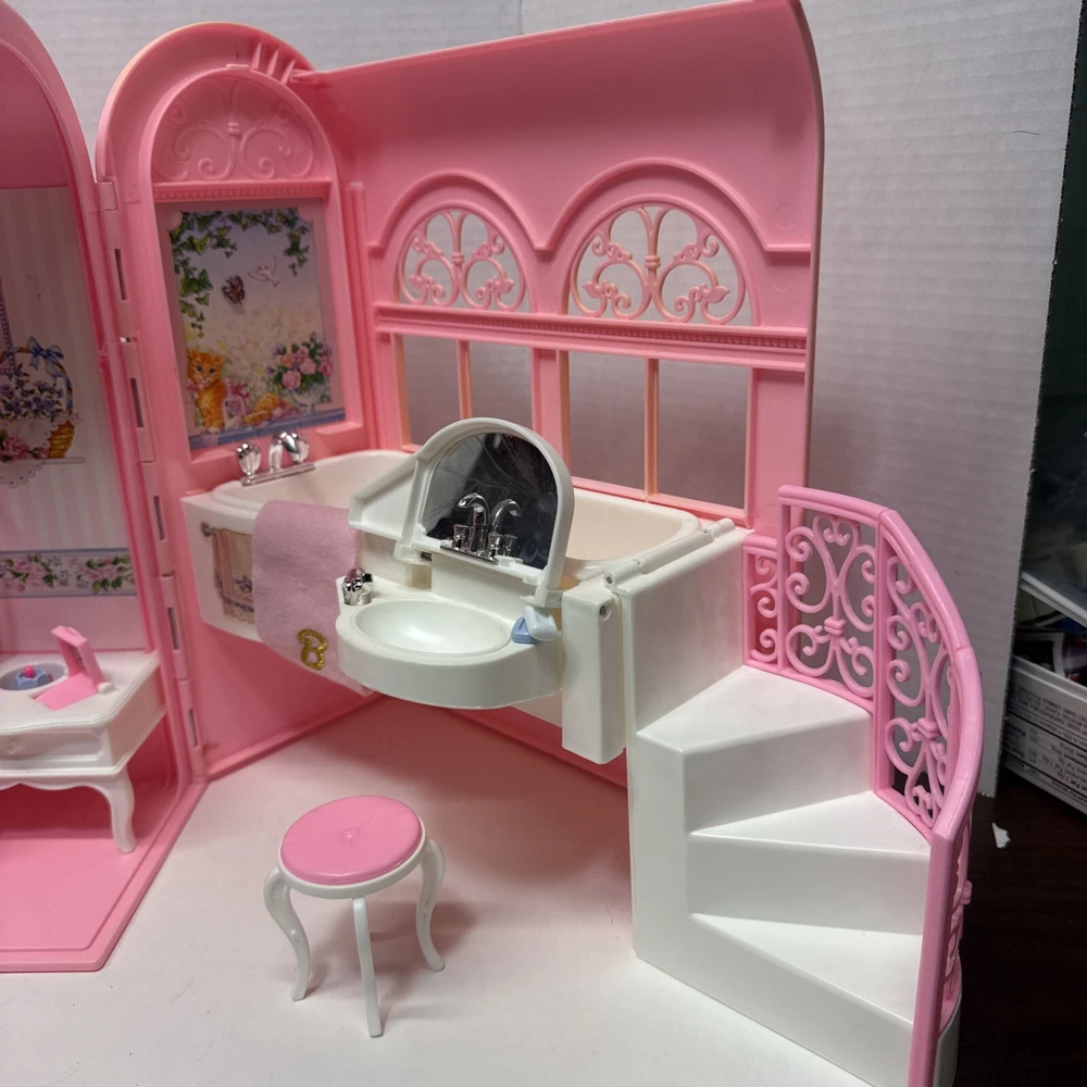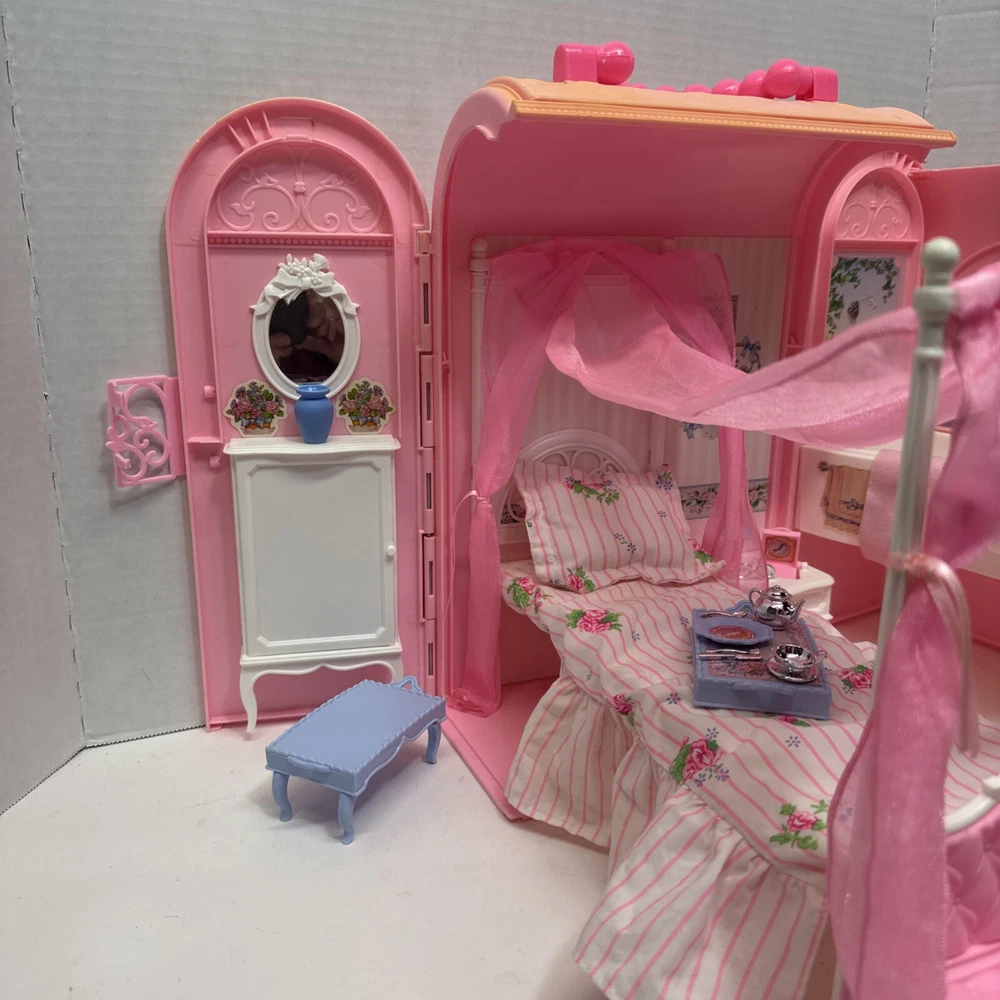 1998 VINTAGE Barbie Bed & Bath Playset House Fold Up Pink Case Purse Doll Set. This compacted toy has everything a child would need to re create bath and sleep. Will have play for hours then pack it up. Light weight to be carried and stored. 2 bed trays, tea pot, tea cup, plate w/ silverware. Canopy & Bed covering with pillow. Stool, hair dryer and 2 soap dishes . Glasses and a pair of shoes. A vase and inside dresser - necklace and bracelet. Comb, brush and pic, 2 purses and a framed photo of Barbie. Total of 27 loose accessories. This case has discoloration on top and shows wear from age and storage. All pieces all a counted for to the best of my knowledge, may have extra and would make a great addition to your existing collection or a play set for a child.
