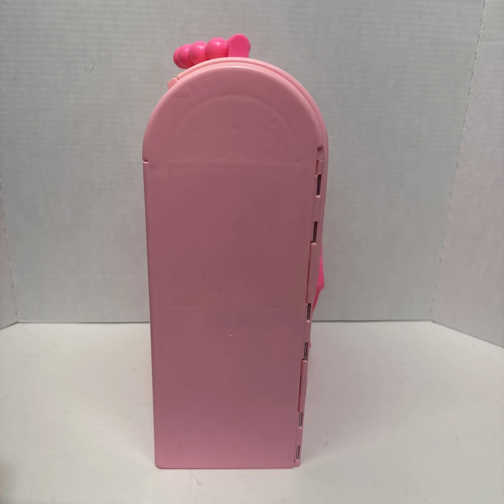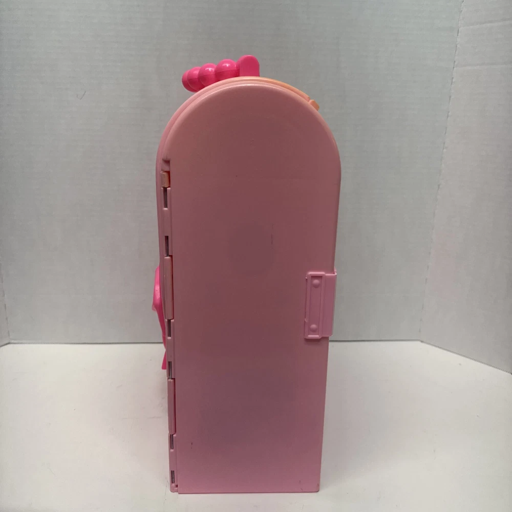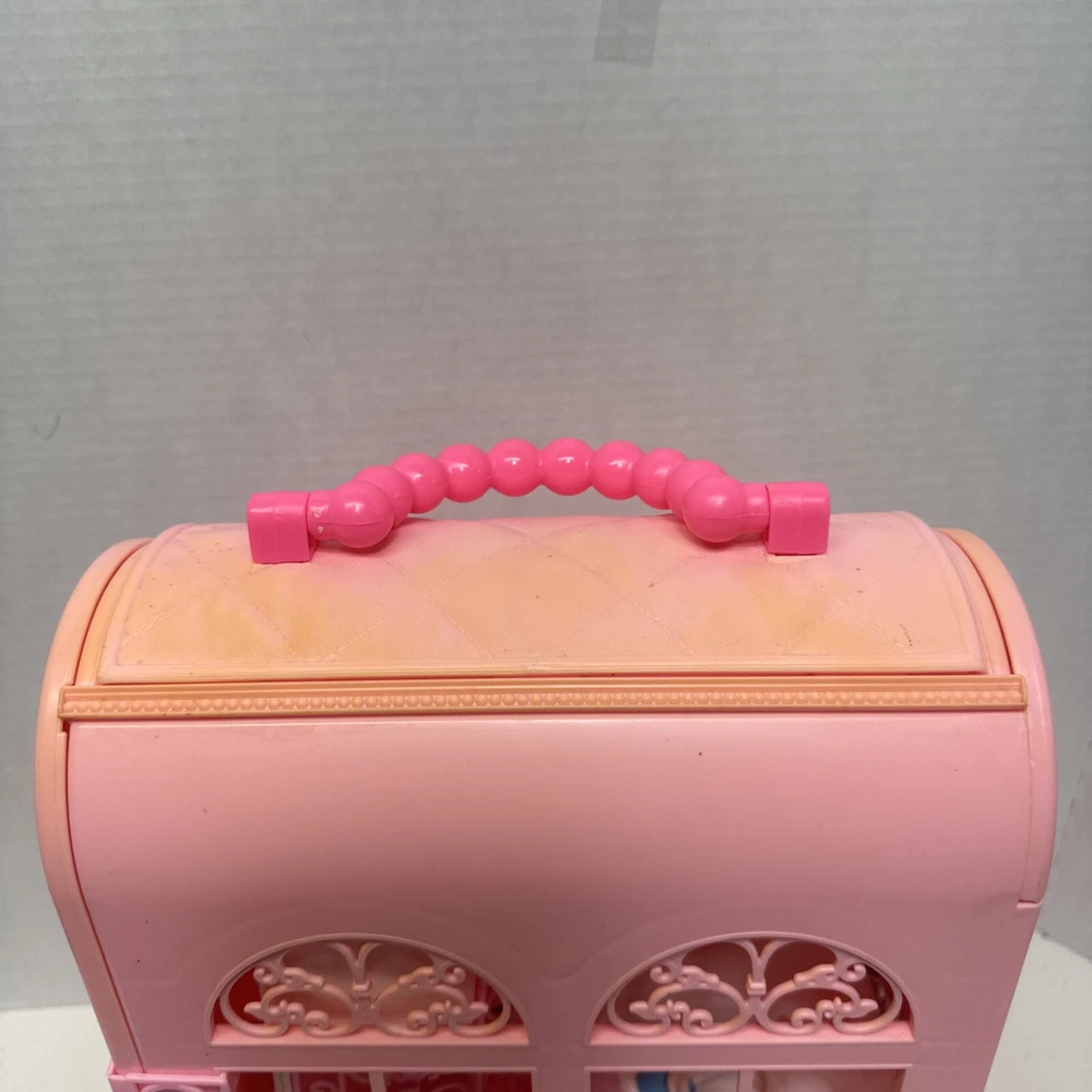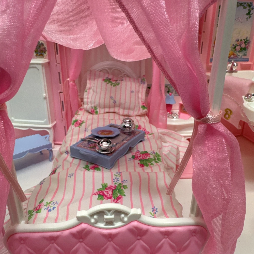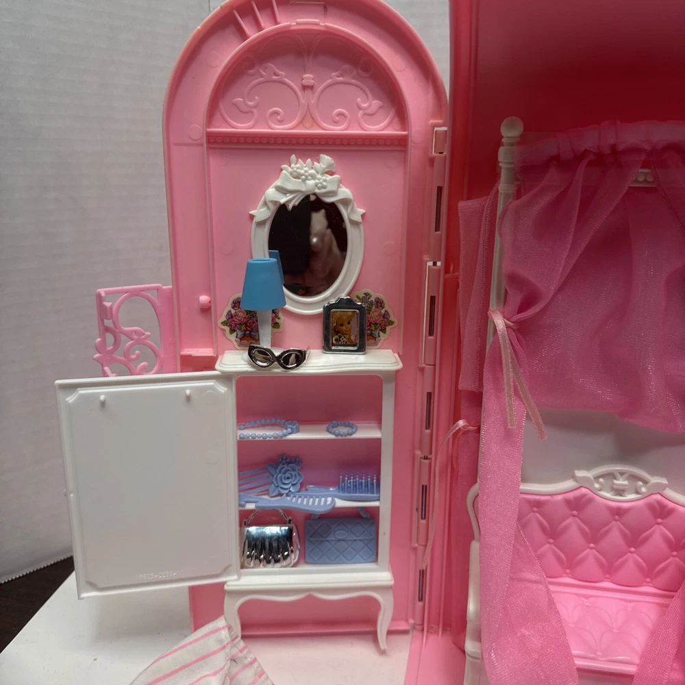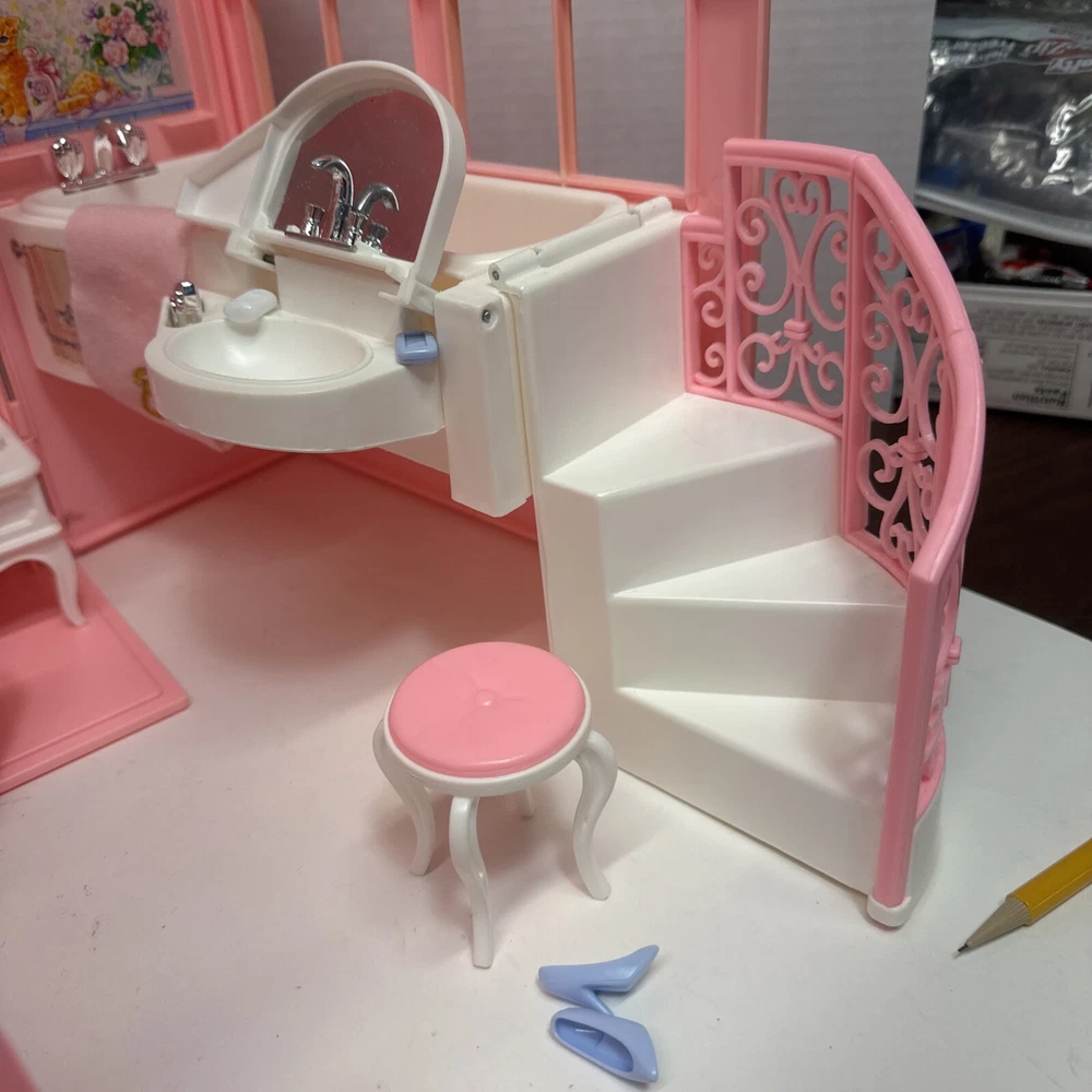 1998 VINTAGE Barbie Bed & Bath Playset House Fold Up Pink Case Purse Doll Set. This compacted toy has everything a child would need to re create bath and sleep. Will have play for hours then pack it up. Light weight to be carried and stored. 2 bed trays, tea pot, tea cup, plate w/ silverware. Canopy & Bed covering with pillow. Stool, hair dryer and 2 soap dishes . Glasses and a pair of shoes. A vase and inside dresser - necklace and bracelet. Comb, brush and pic, 2 purses and a framed photo of Barbie. Total of 27 loose accessories. This case has discoloration on top and shows wear from age and storage. All pieces all a counted for to the best of my knowledge, may have extra and would make a great addition to your existing collection or a play set for a child.