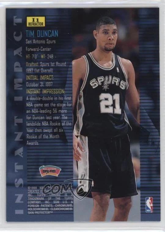 1998-99 Topps Chrome - Instant Impact - Refractor #I1 Tim Duncan - Basketball Card - Featuring the San Antonio Spurs - Featuring Tim Duncan Search for more: 1998-99 Topps Chrome Search for more: 1998-99 Topps Chrome - Instant Impact - Refractor View all of our Listings Auctions Buy It Now About Us Located in the beautiful Pacific Northwest, COMC (Check Out My Cards) is the world's largest consignment service for trading card singles. More than 10,000 people have used our consignment service to list over 50 million trading cards. We currently house 20 million cards, each listed for sale with front and back images of the actual card. Find out how we can help you consign your items on eBay by contacting us through eBay messaging. COMC -- "The Safe & Easy Way to Buy & Sell" Representative Image - Select Specific Item above to see image of actual item Representative Image - Select Specific Item above to see image of actual item Raw Condition for Modern Cards Unless otherwise noted, raw modern cards are listed in Near Mint-Mint condition or better. A NM-MT card appears to be Mint at first glance, but upon closer inspection, may exhibit some of the following: minor print defects (e.g. roller marks, print line, dimple), minor scratches, slight edge wear, and slight corner wear. Centering is clearly visible in the images provided and does not factor into our condition assessment. Raw Condition for Vintage Cards Unless otherwise noted, raw vintage cards are listed in Excellent condition or better. An EX card may exhibit some of the following: minor rounding of corners, surface wear, print defects, light scratches, and slight edge wear/chipping. Centering is clearly visible in the images provided and does not factor into our condition assessment. Domestic Shipping Combined shipping for multiple items is available. To receive combined shipping, please ensure all desired items are in your eBay shopping cart before proceeding to checkout. eBay limits orders to 40 items per order. We automatically combine multiple orders placed on the same day. If you place multiple orders on the same day, please contact us to request a refund of applicable shipping costs. Signature confirmation may be required on invoices over $400. Raw cards are shipped in toploaders. International Shipping COMC offers eBay's International Shipping (EIS) for international orders under $2,500* (see country exceptions below). All duties and import fees are paid at checkout; in the rare event that there are additional import fees upon delivery, these are borne by the buyer. EIS packages route through a shipping hub in Erlanger, KY before shipping to their final destination. Please note that EIS does not allow for combined shipments. The shipping rates are determined by eBay and cannot be adjusted. *Maximum sale price exceptions: Colombia, Kuwait ($2,000); Taiwan ($1,539); Chile, Costa Rica, Guatemala, Honduras, Trinidad and Tobago ($1,000); Antigua and Barbuda, Aruba, Belize, Dominica, Grenada, Philippines, Saint Kitts and Nevis, Saint Lucia, Montserrat, Turks and Caicos Islands ($500); Dominican Republic, El Salvador ($200). Please request a shipping quote through eBay messaging for orders that exceed the maximum sale price supported by eBay's International Shipping. You will be responsible for all duties and import fees for international orders shipped outside the EIS. Raw cards are shipped in toploaders. Payment COMC does not accept offers on our cards through our eBay storefront. COMC utilizes eBay’s managed payments system. If you are experiencing difficulties making a payment, please contact eBay for assistance. Return Policy Returns are only accepted on the rare occasion the item is not as described. If you are making a return, please initiate the return process through eBay so a mailing label can be provided for you. Prior to listing, our expert team carefully assessed this item to represent it accurately. Please review the description and high-definition images prior to purchasing to ensure this item meets your satisfaction. We welcome you to contact us if you have further questions about this item. Trust and Integrity COMC carefully assesses each item consigned to us to prevent fraudulent items from entering the marketplace. If you believe an item offered on COMC may be fraudulent, please contact us with details so we can investigate the issue. Items we determine are outside our supported items policy may be removed. Last Modified: 10/20/2024 3:48:16 AM PDT