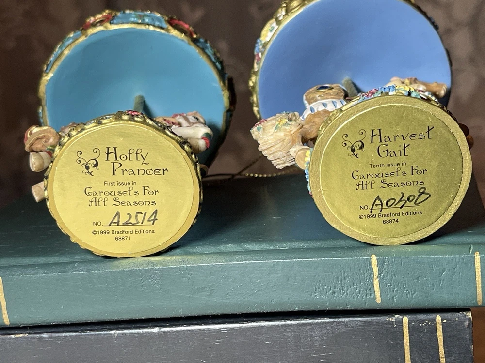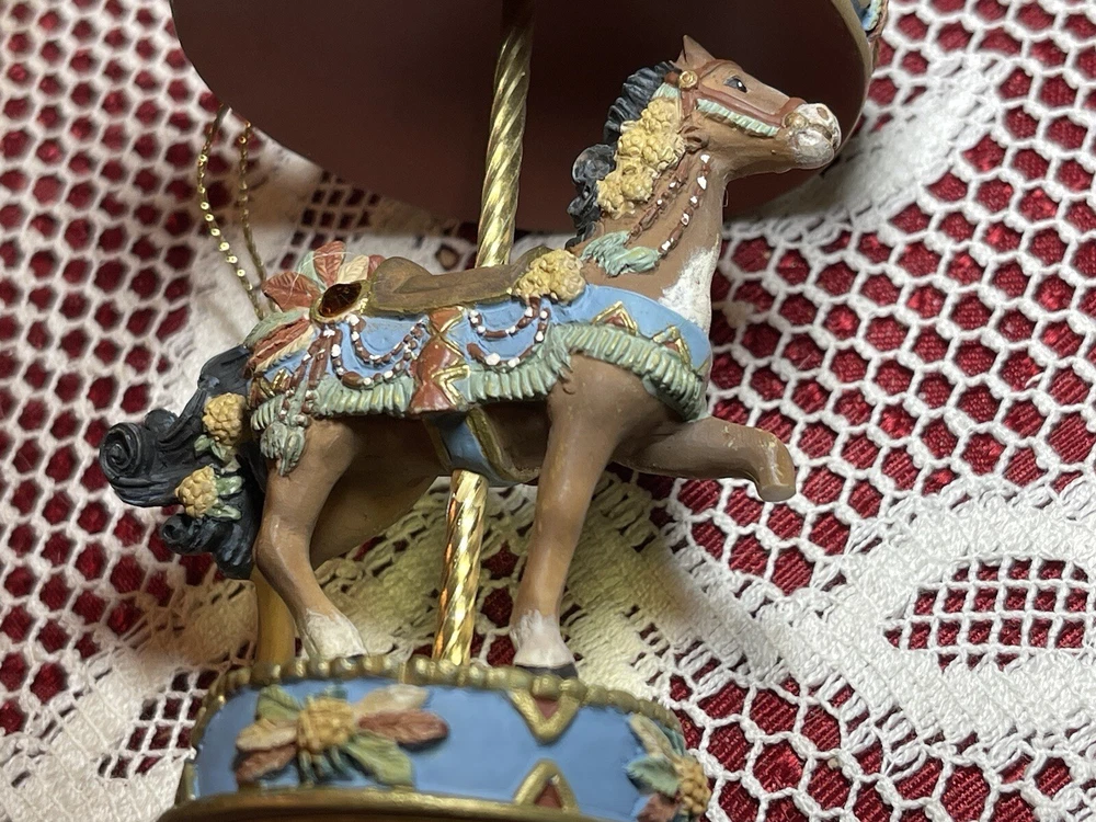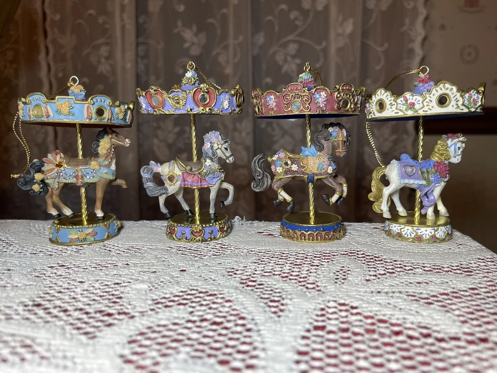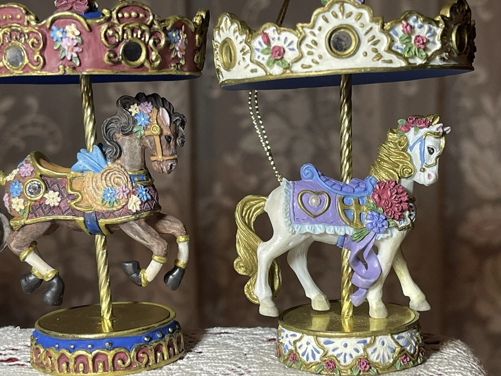 Enhance your holiday decorations with this beautiful set of 8 Bradford Edition Carousel Horse Ornaments. Crafted with exquisite details, these multicolored ornaments are perfect for any collector or horse lover. Each ornament portrays a different horse, representing a season or holiday, making them a great addition to your Christmas tree or year-round decor. The set includes a variety of horses from the Bradford Exchange, all manufactured in 1999. Don't miss out on this unique collection of carousel horse ornaments. Stones are intact on each side of horse except for one side, light green stone, on Summertime Cantor. I have relisted them and lowered the price because 4 of the 8 have repairs in the resin pictured and one with missing lower leg, can’t really tell on a tree but priced accordingly. These are really detailed and beautiful! Need a new home that would appreciate them.