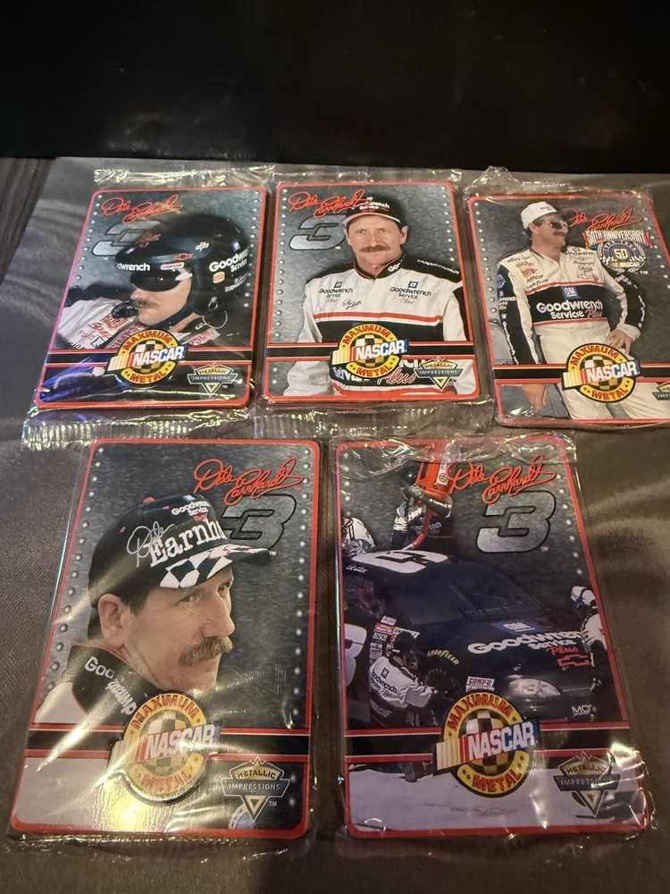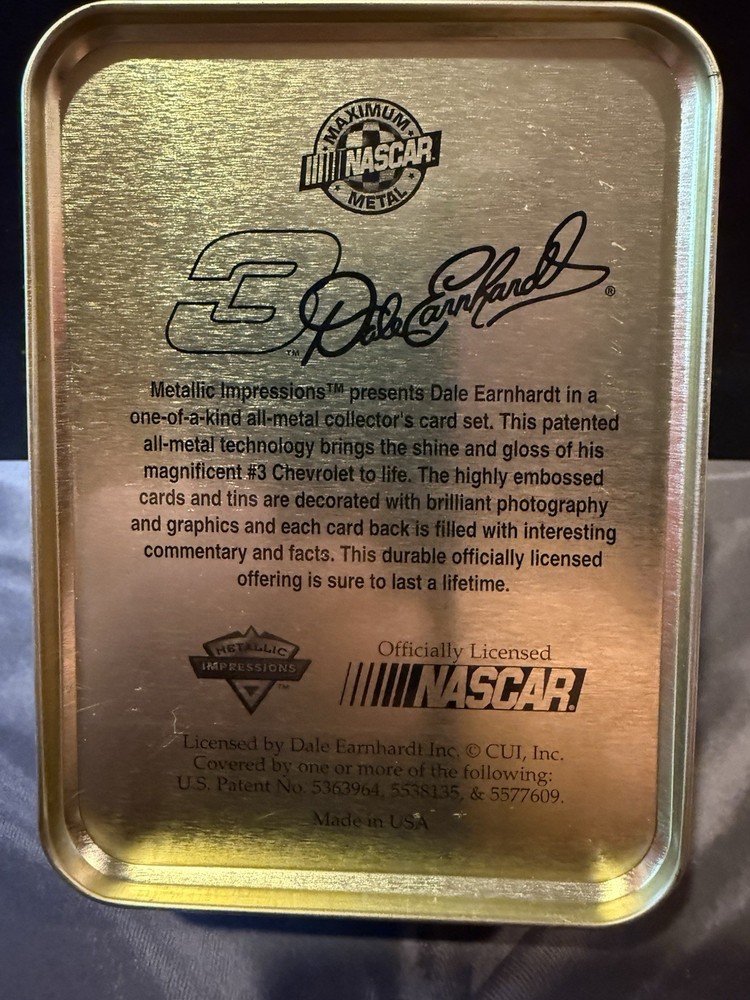 Officially licensed Dale Earnhardt Sr. #3 “Maximum Metal” NASCAR collector set featuring five all-metal cards housed in the original metal tin. • Includes 5 sealed all-metal collector cards • Cards remain factory sealed in original wrappers • Heavy embossed metal display tin • Official NASCAR licensed product • Produced by Metallic Impressions / Maximum Metal • Made in the USA Cards feature full-color photography and biographical information on Dale Earnhardt Sr. Tin shows light normal wear from storage. See photos for exact condition — you will receive the item shown. Perfect for NASCAR fans, Dale Earnhardt collectors, or display.