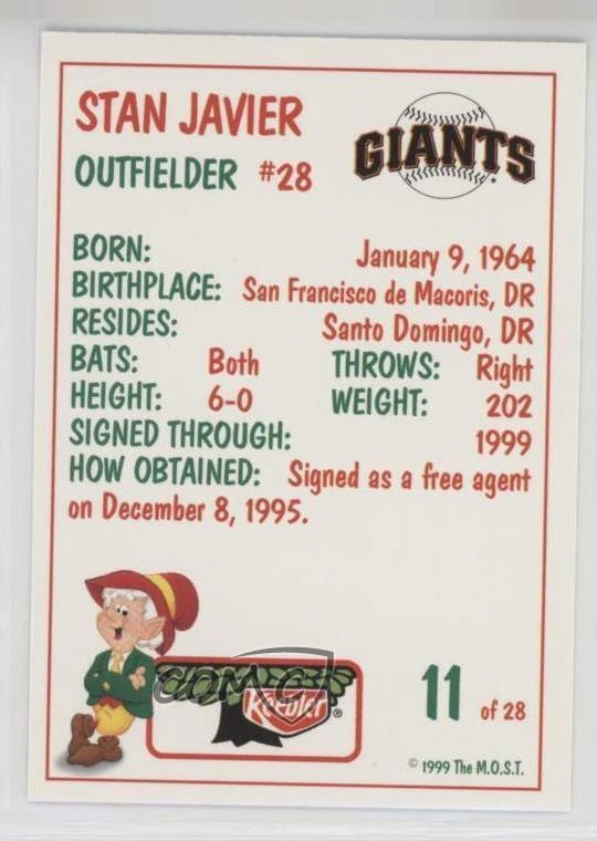1999 Keebler San Francisco Giants - Stadium Giveaway [Base] #11 Stan Javier - Baseball Card - Featuring the San Francisco Giants - Featuring Stan Javier Search for more: 1999 Keebler San Francisco Giants Search for more: 1999 Keebler San Francisco Giants - Stadium Giveaway [Base] View all of our Listings Auctions Buy It Now About Us Located in the beautiful Pacific Northwest, COMC (Check Out My Cards) is the world's largest consignment service for trading card singles. More than 10,000 people have used our consignment service to list over 50 million trading cards. We currently house 20 million cards, each listed for sale with front and back images of the actual card. Find out how we can help you consign your items on eBay by contacting us through eBay messaging. COMC -- "The Safe & Easy Way to Buy & Sell" Representative Image - Select Specific Item above to see image of actual item Representative Image - Select Specific Item above to see image of actual item Raw Condition for Modern Cards Unless otherwise noted, raw modern cards are listed in Near Mint-Mint condition or better. A NM-MT card appears to be Mint at first glance, but upon closer inspection, may exhibit some of the following: minor print defects (e.g. roller marks, print line, dimple), minor scratches, slight edge wear, and slight corner wear. Centering is clearly visible in the images provided and does not factor into our condition assessment. Raw Condition for Vintage Cards Unless otherwise noted, raw vintage cards are listed in Excellent condition or better. An EX card may exhibit some of the following: minor rounding of corners, surface wear, print defects, light scratches, and slight edge wear/chipping. Centering is clearly visible in the images provided and does not factor into our condition assessment. Domestic Shipping Combined shipping for multiple items is available. To receive combined shipping, please ensure all desired items are in your eBay shopping cart before proceeding to checkout. eBay limits orders to 40 items per order. We automatically combine multiple orders placed on the same day. If you place multiple orders on the same day, please contact us to request a refund of applicable shipping costs. Signature confirmation may be required on invoices over $400. Raw cards are shipped in toploaders. International Shipping COMC offers eBay's International Shipping (EIS) for international orders under $2,500* (see country exceptions below). All duties and import fees are paid at checkout; in the rare event that there are additional import fees upon delivery, these are borne by the buyer. EIS packages route through a shipping hub in Erlanger, KY before shipping to their final destination. Please note that EIS does not allow for combined shipments. The shipping rates are determined by eBay and cannot be adjusted. *Maximum sale price exceptions: Colombia, Kuwait ($2,000); Taiwan ($1,539); Chile, Costa Rica, Guatemala, Honduras, Trinidad and Tobago ($1,000); Antigua and Barbuda, Aruba, Belize, Dominica, Grenada, Philippines, Saint Kitts and Nevis, Saint Lucia, Montserrat, Turks and Caicos Islands ($500); Dominican Republic, El Salvador ($200). Please request a shipping quote through eBay messaging for orders that exceed the maximum sale price supported by eBay's International Shipping. You will be responsible for all duties and import fees for international orders shipped outside the EIS. Raw cards are shipped in toploaders. Payment COMC does not accept offers on our cards through our eBay storefront. COMC utilizes eBay’s managed payments system. If you are experiencing difficulties making a payment, please contact eBay for assistance. Return Policy Returns are only accepted on the rare occasion the item is not as described. If you are making a return, please initiate the return process through eBay so a mailing label can be provided for you. Prior to listing, our expert team carefully assessed this item to represent it accurately. Please review the description and high-definition images prior to purchasing to ensure this item meets your satisfaction. We welcome you to contact us if you have further questions about this item. Trust and Integrity COMC carefully assesses each item consigned to us to prevent fraudulent items from entering the marketplace. If you believe an item offered on COMC may be fraudulent, please contact us with details so we can investigate the issue. Items we determine are outside our supported items policy may be removed. Last Modified: 12/30/2024 8:18:48 PM PDT