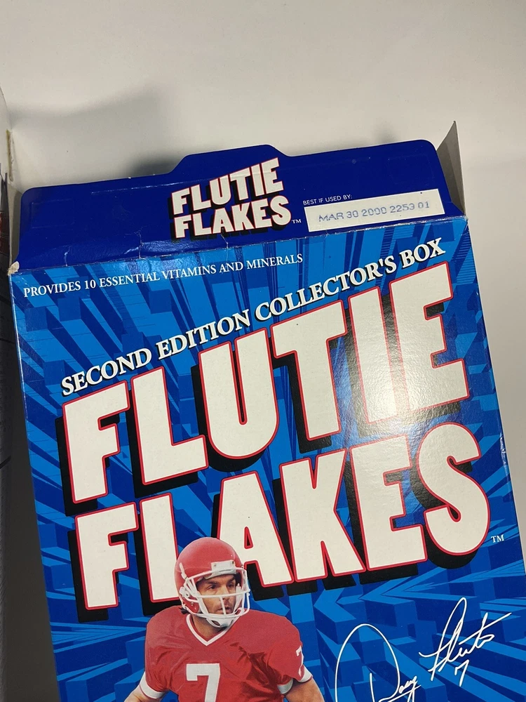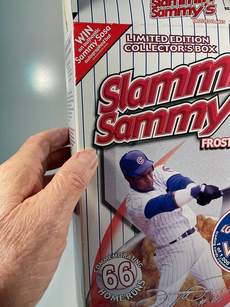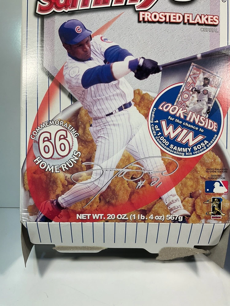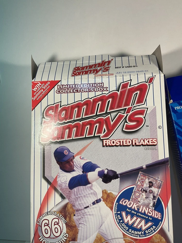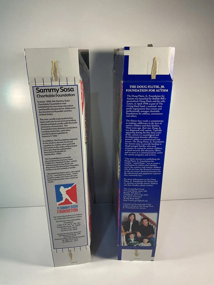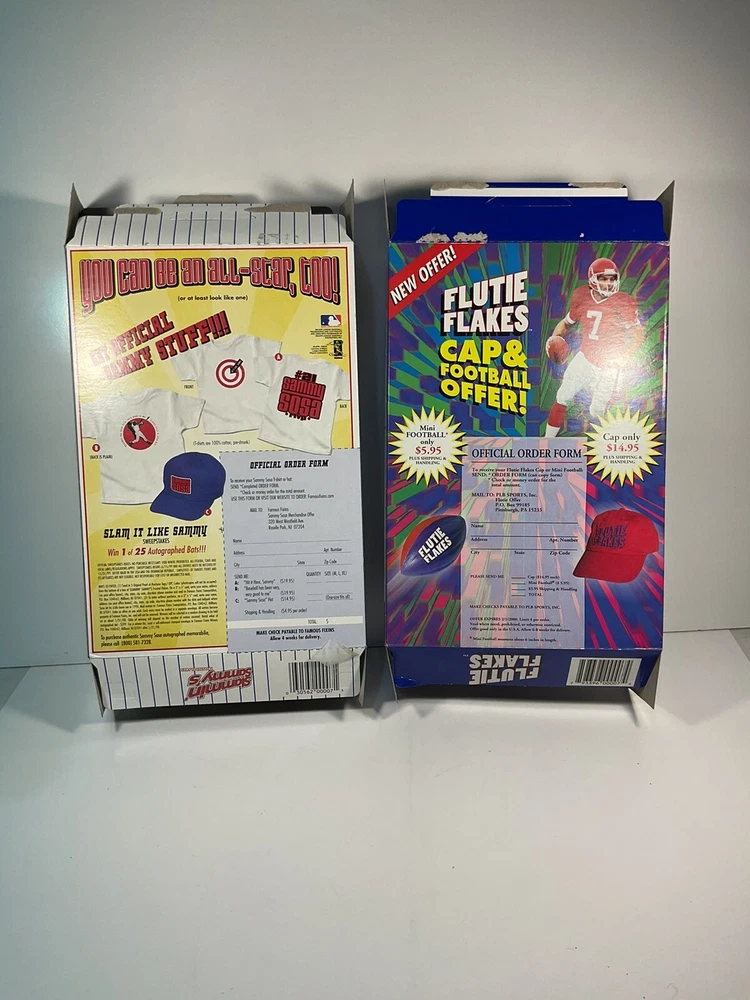 The product is a vintage 1999 Limited Edition Slammin' Sammy's Frosted Flakes cereal box featuring baseball player Sammy Sosa, as well as Flutie Flakes featuring football player Doug Flutie. Both cereals were likely part of a promotional campaign in the United States, with the box design showcasing the athletes' popularity during that time. These collectible cereal boxes are original from the year 1999 and would be a nostalgic and unique addition to any sports memorabilia collection. Boxes are Flat and will be packed quickly and shipped safely by USPS. THANKS
