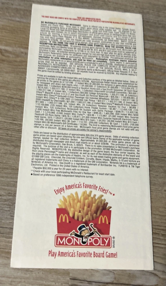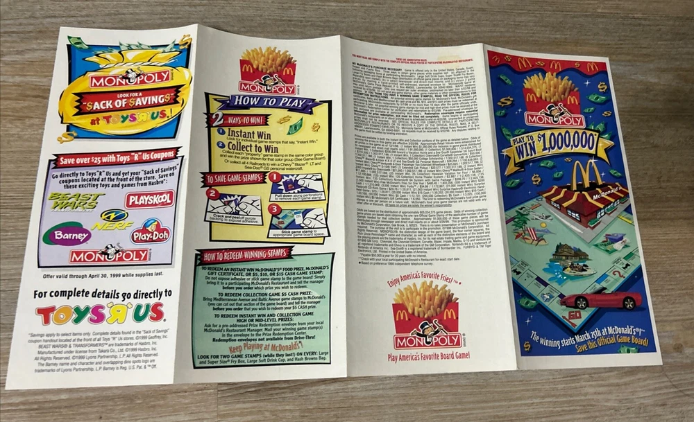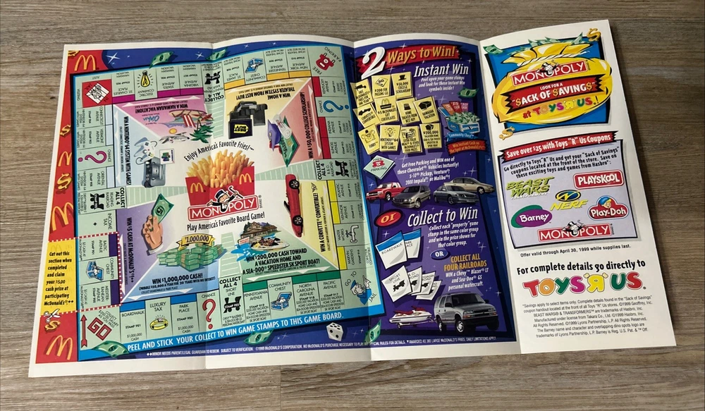 This 1999 McDonald's Monopoly Game Board is a must-have for any collector of restaurant and fast food memorabilia. Featuring the iconic McDonald's logo and the beloved board game theme, this item is sure to bring back fond memories of childhood game nights and family gatherings. Heavy Toys R Us advertising.