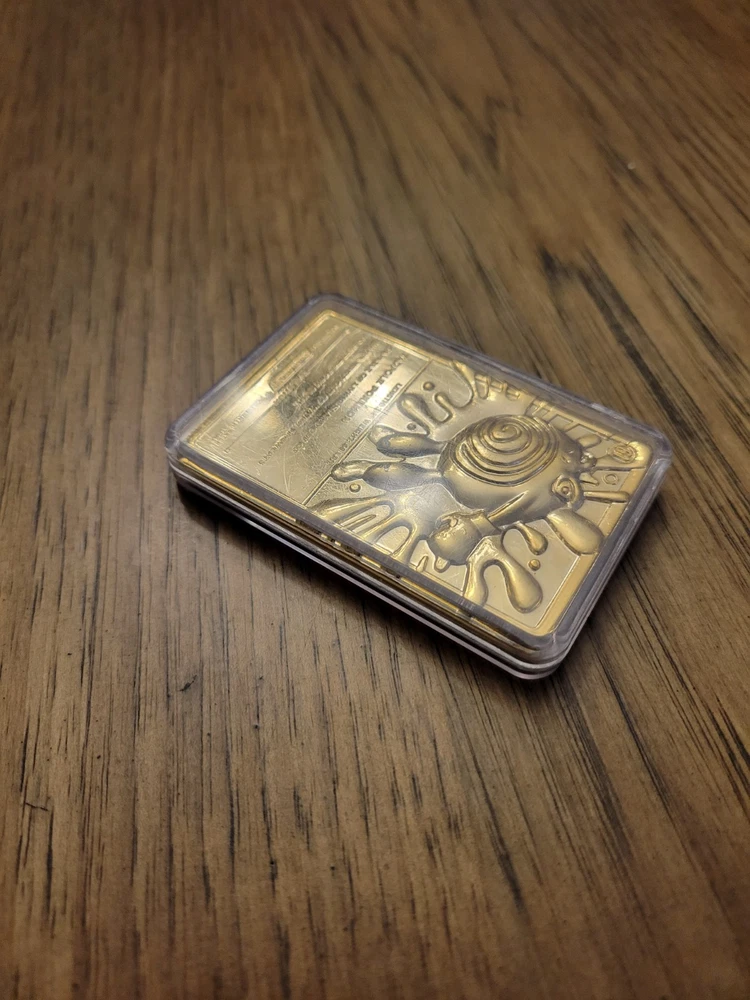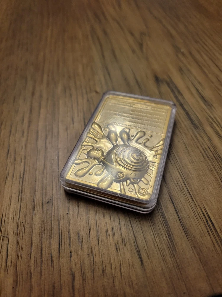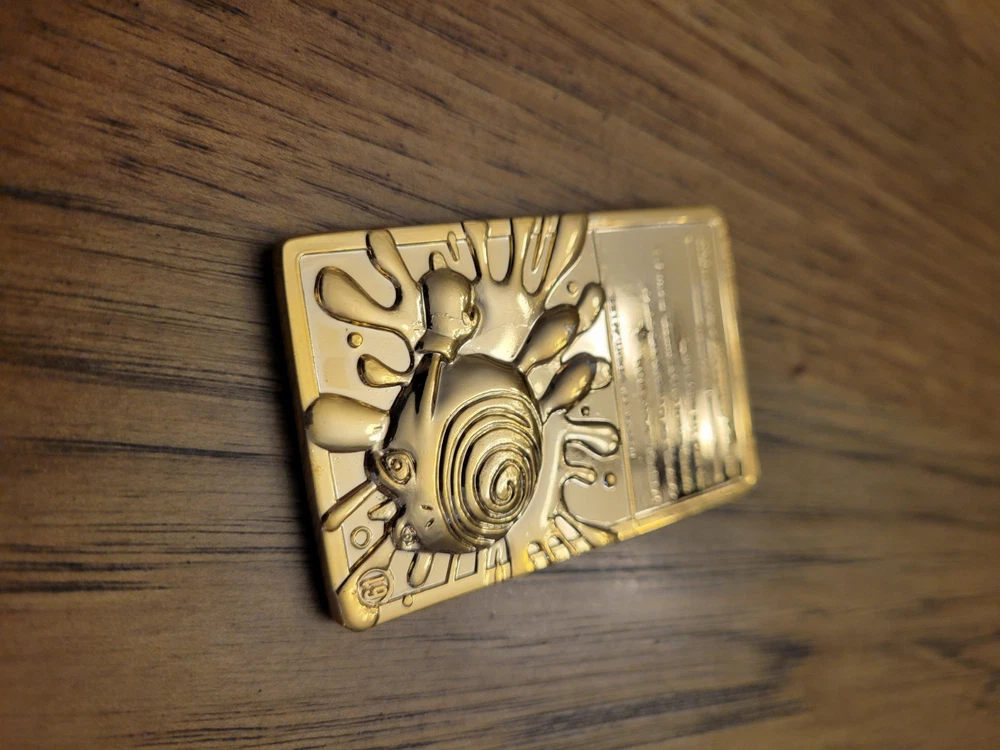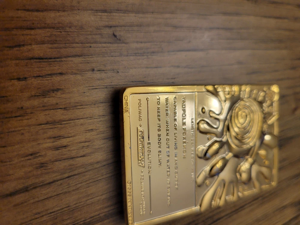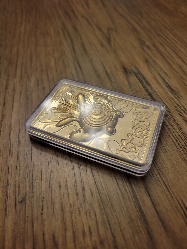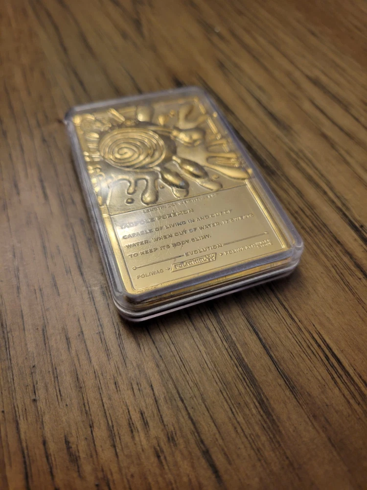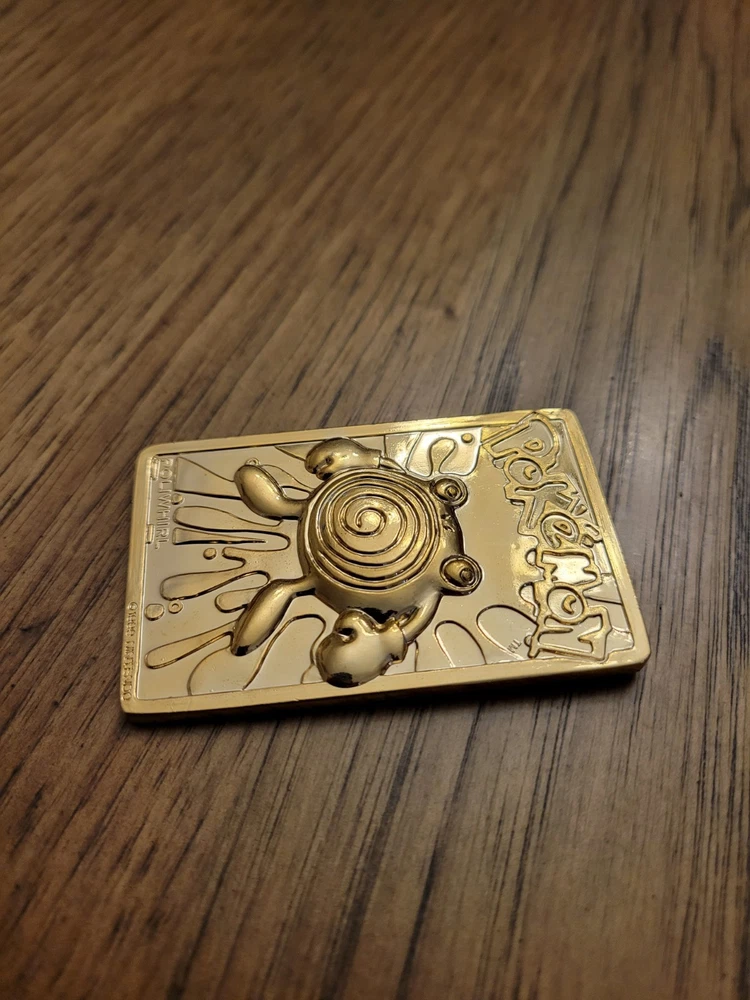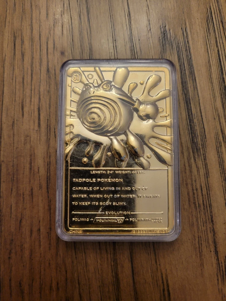 Pokemon POLIWHIRL Gold Plated Trading Card 1999 Nintendo With Case Card has been in it's case basically it's entire existence but does show a few signs of wear. I got this when they were released and have had this in my collection since. Notable wear includes a couple chips in the rear bottom border of card to the right of CHINA as well as worn sections on Poliwhirl's feet also on rear of card. Face of card has a few faint scratches and there are a couple pin sized chips above Poliwhirl on front face of card. Plastic case has a scratch on the back and a few light surface scratches. Feel free to reach out with further questions.