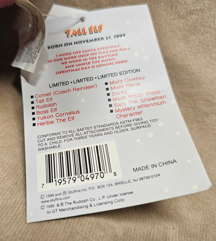 Features: Retired, Washable Size: Small (6-14 in) Country/Region of Manufacture: China gtin13: 719579049708 Color: Blue Year: 1999 Character Family: Santa's Elf UPC: 719579049708 Animal: Elf Occasion: Christmas Brand: Stuffins
