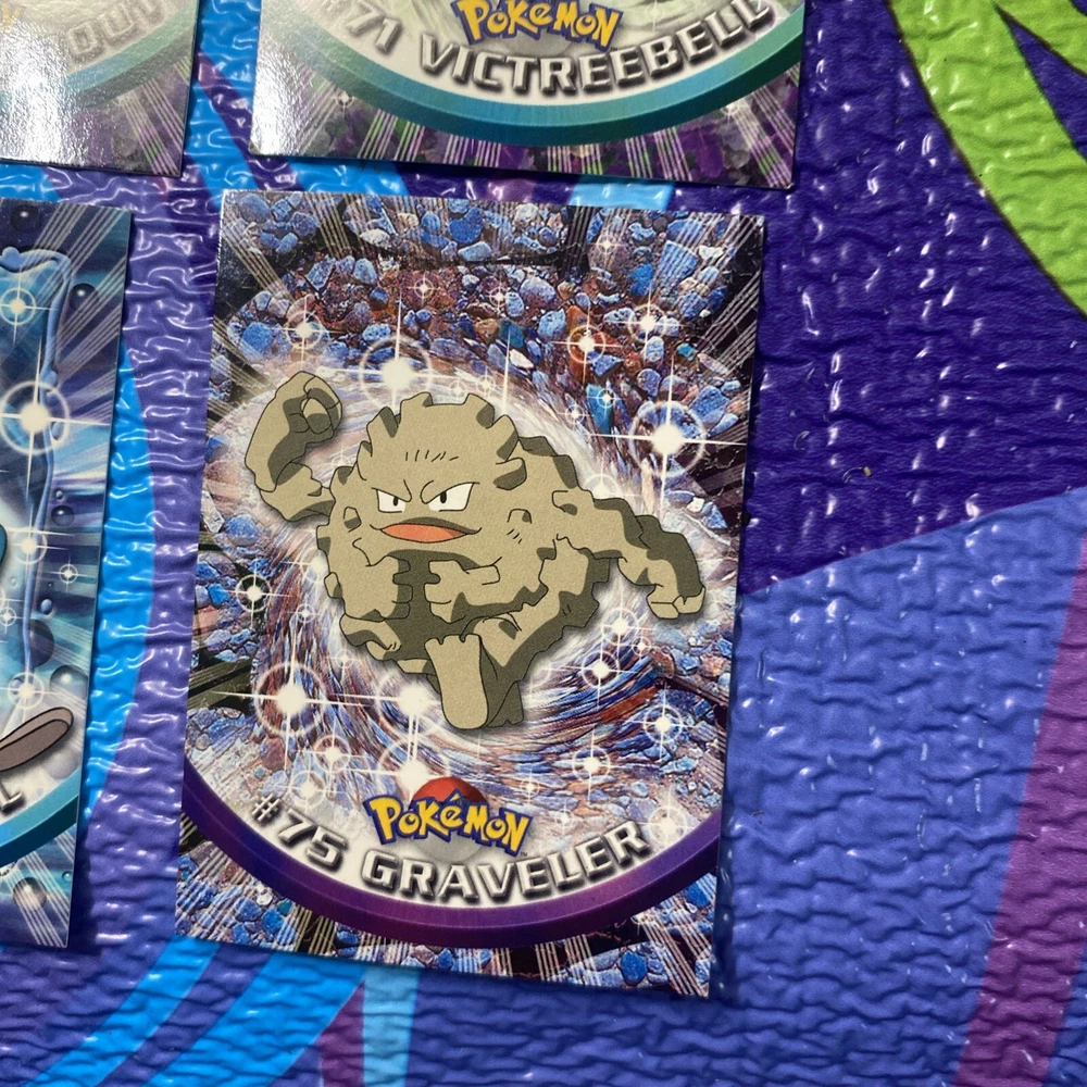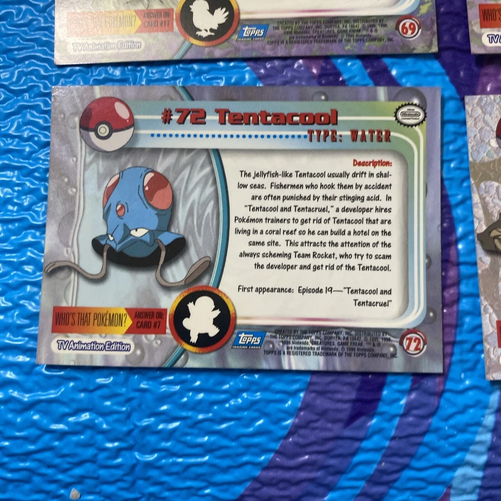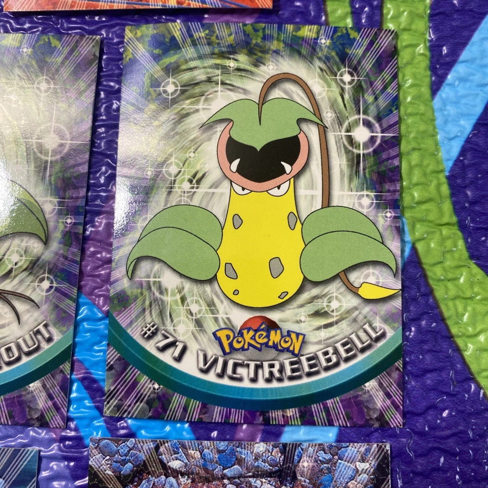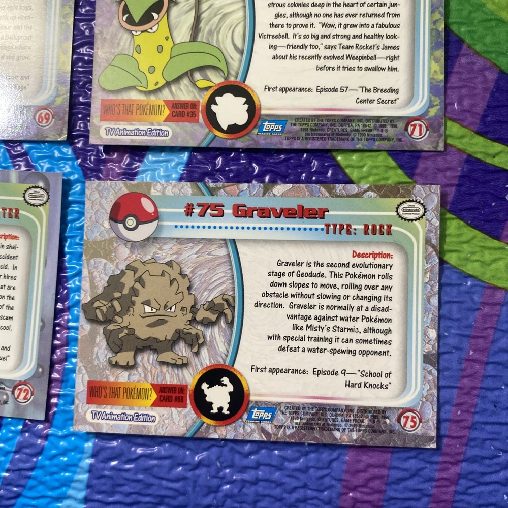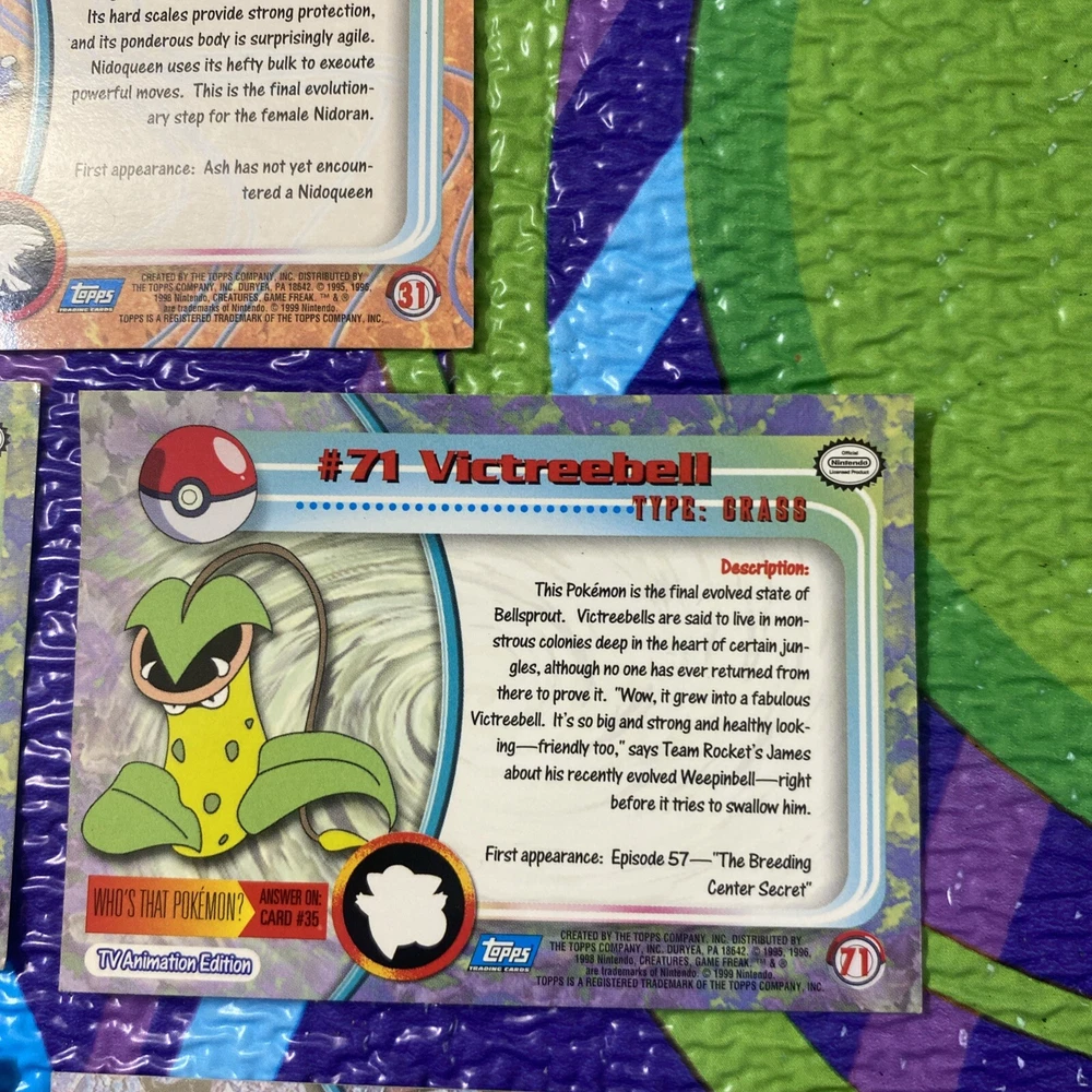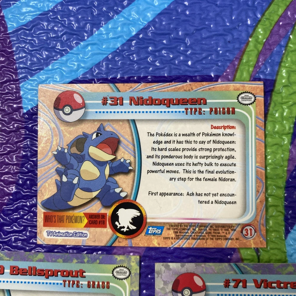 Explore the world of Pokémon with this 5-card lot from the 1999 Topps Series 1 Pokémon TV Animation Edition. Featuring characters like Victreebel, Tentacool, Bellsprout, Nidoqueen, and Graveler, this collection is a throwback to the early days of Pokémon trading cards. Each card numbers 31, 69, 71, 72, and 73, adding a unique piece of Pokémon history to your assortment. These cards are produced by the collaborative effort of Nintendo and Topps, offering a variety of attributes including Colorless, Dark, and Fire. They are crafted from standard card stock and come in English. As collectible items from the United States, they showcase the vintage appeal of the Pokémon TCG, perfect for enthusiasts and collectors over the age of 6.