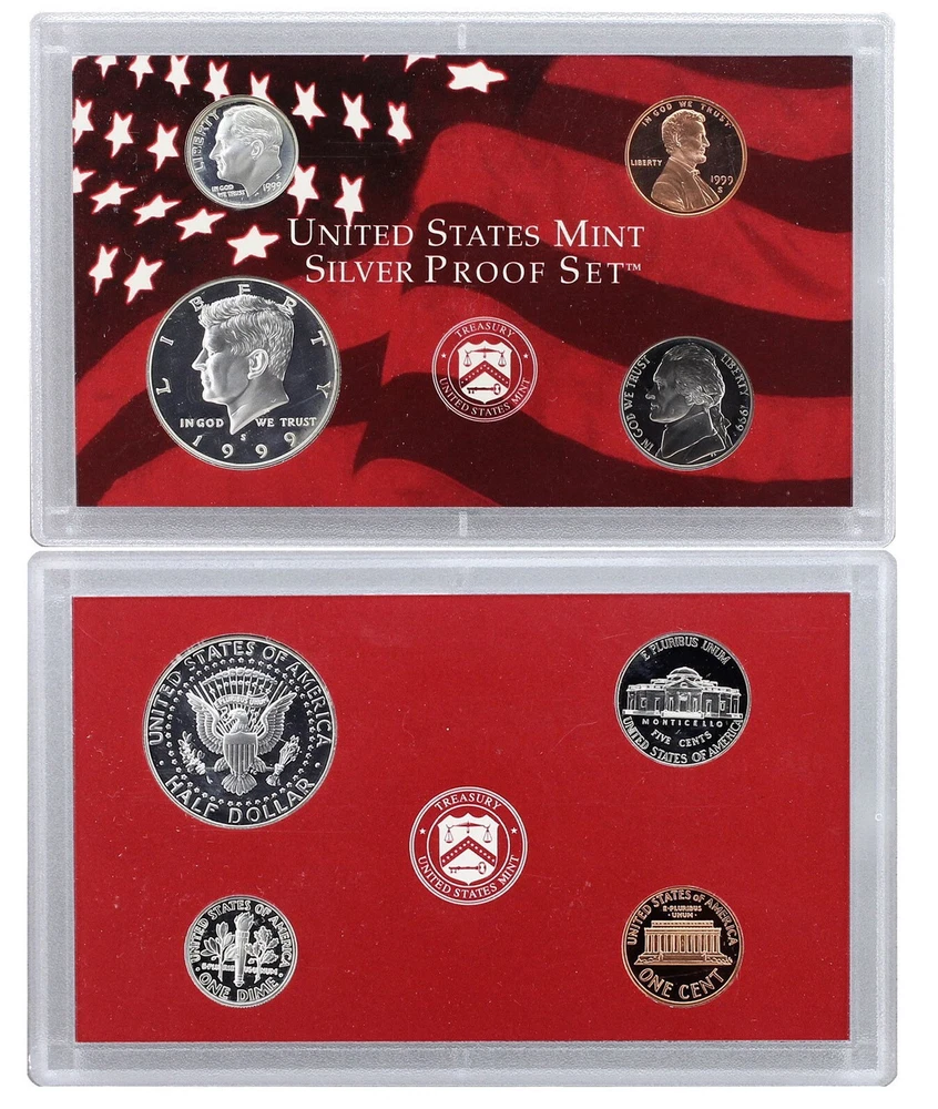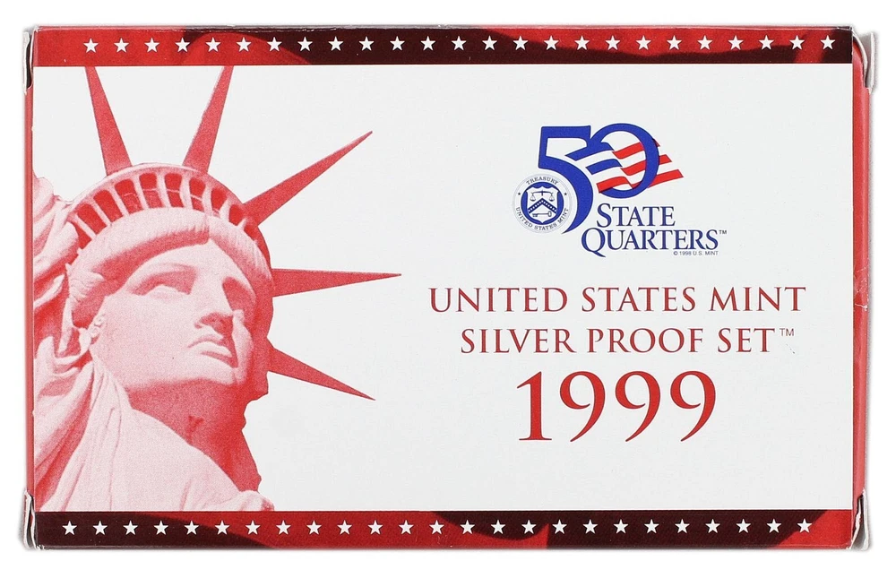 1999 United States Mint Silver Proof Set - 9 Coins - COA & OGP 90% Silver This 1999 U.S. Mint Silver Proof Set contains 9 proof condition coins. This set contains the Lincoln Cent, the Jefferson Nickel, the Roosevelt Dime, Kennedy Half-Dollar, and all five of the Washington Quarter-Dollars minted for the 50 State Quarters Program in 1999. The 5 state quarters include Delaware, Georgia, Pennsylvania, New Jersey and Connecticut, and are minted in 90% silver, as are the dime, quarter, and half dollar. All 5 quarters share the same Washington obverse. This 1999 U.S. Mint Silver Proof set comes in like new condition, sealed in two plastic display cases as packaged by the U.S. Mint, and includes the original Mint packaging box and Certificate of Authenticity.