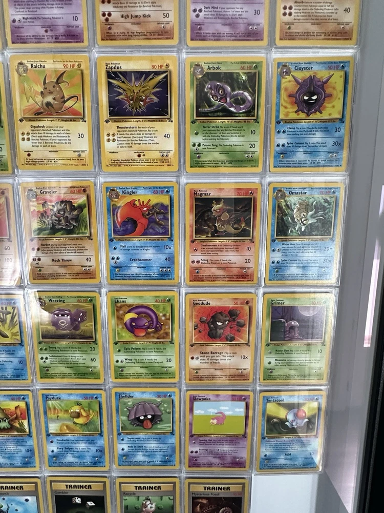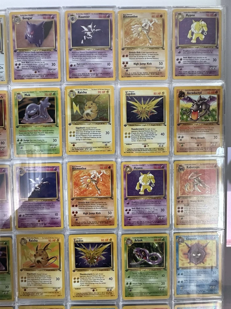 Complete 1st Edition Fossil Set – Pokémon TCG (1999) Framed Collector’s Display This is a fully complete 1st Edition Fossil Set (62/62) from the 1999 Wizards of the Coast Pokémon Trading Card Game release. Every card in this framed set is 100% authentic, 1st edition, and a preserved part of Pokémon TCG history. Authenticity: All cards have been professionally authenticated by PSA . While sold as ungraded , each card retains its original PSA label mounted inside the reverse of its individual acrylic case for verification and provenance. Condition: All cards are in near mint or better condition and individually sealed in crystal-clear acrylic cases for protection and display. Framing: The entire set is beautifully mounted in a custom 34" x 25.75" shadowbox-style frame, protected behind museum-quality, UV-resistant acrylic to ensure long-term preservation. Set Highlights: Includes all 62 cards from the original Fossil Set Key cards such as Articuno, Dragonite, Gengar, Moltres, and more Professionally arranged for visual balance and collector appeal This is a premium collector’s piece—perfect for display in a home office, game room, gallery wall, or personal Pokémon museum. A rare opportunity to own a full set of one of the earliest expansions in its finest form. Shipping & Handling: Securely packaged with full insurance. Local pickup is available upon request. Serious collectors only.