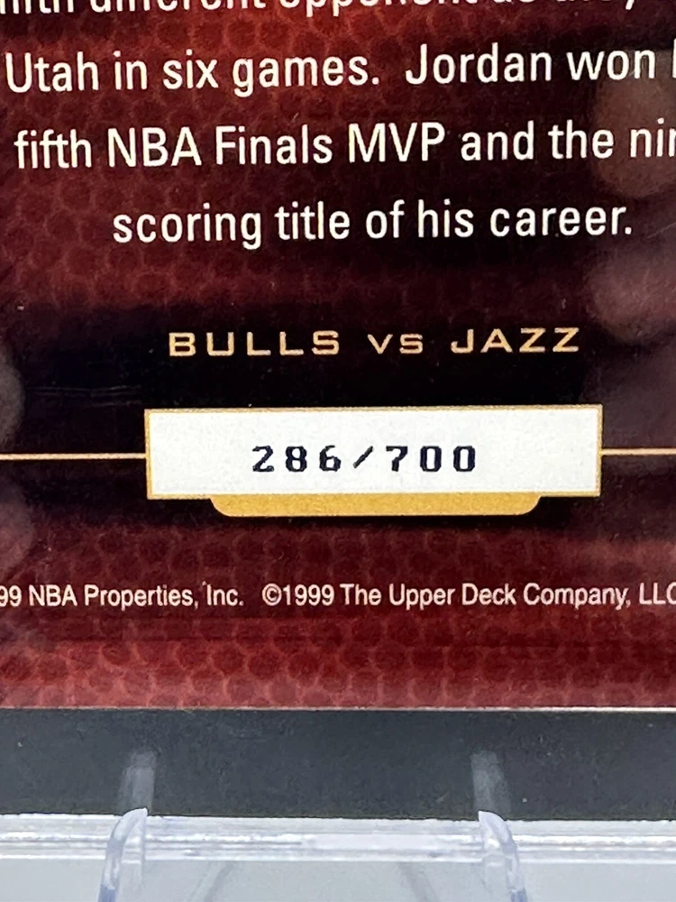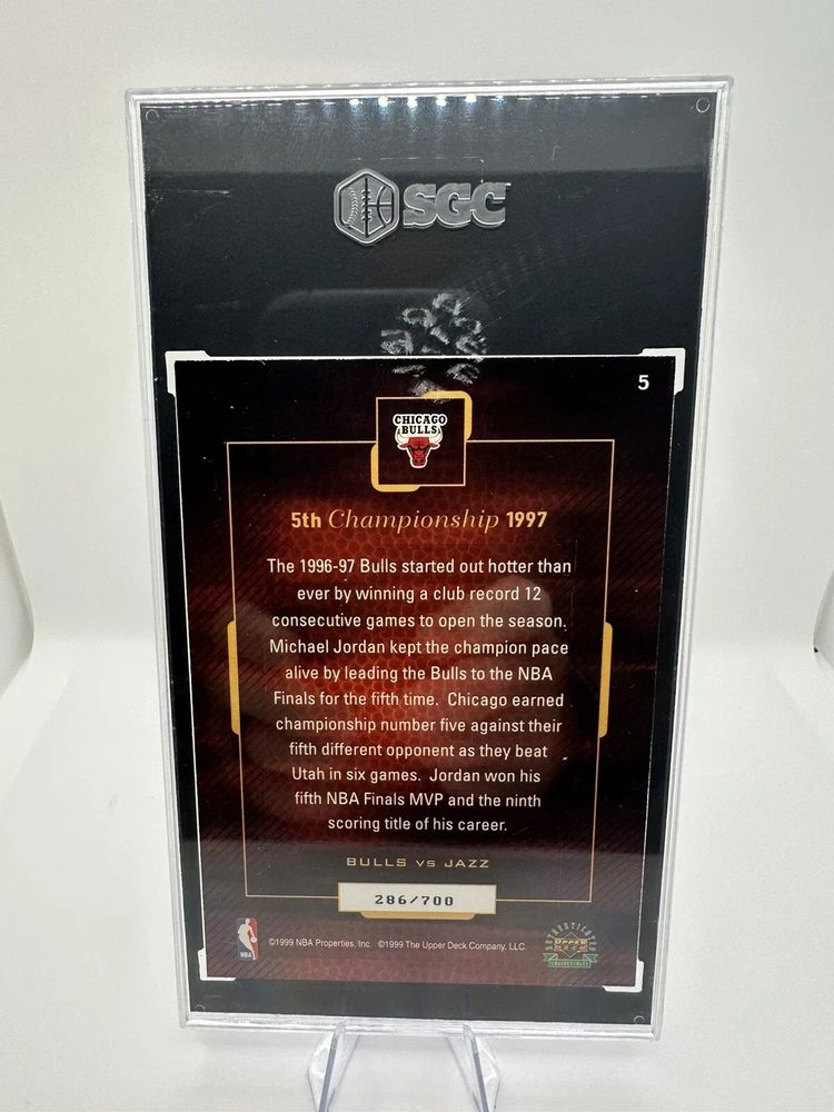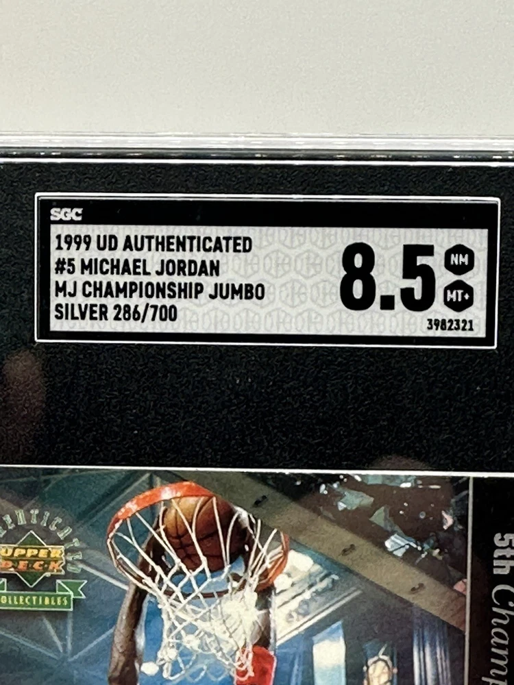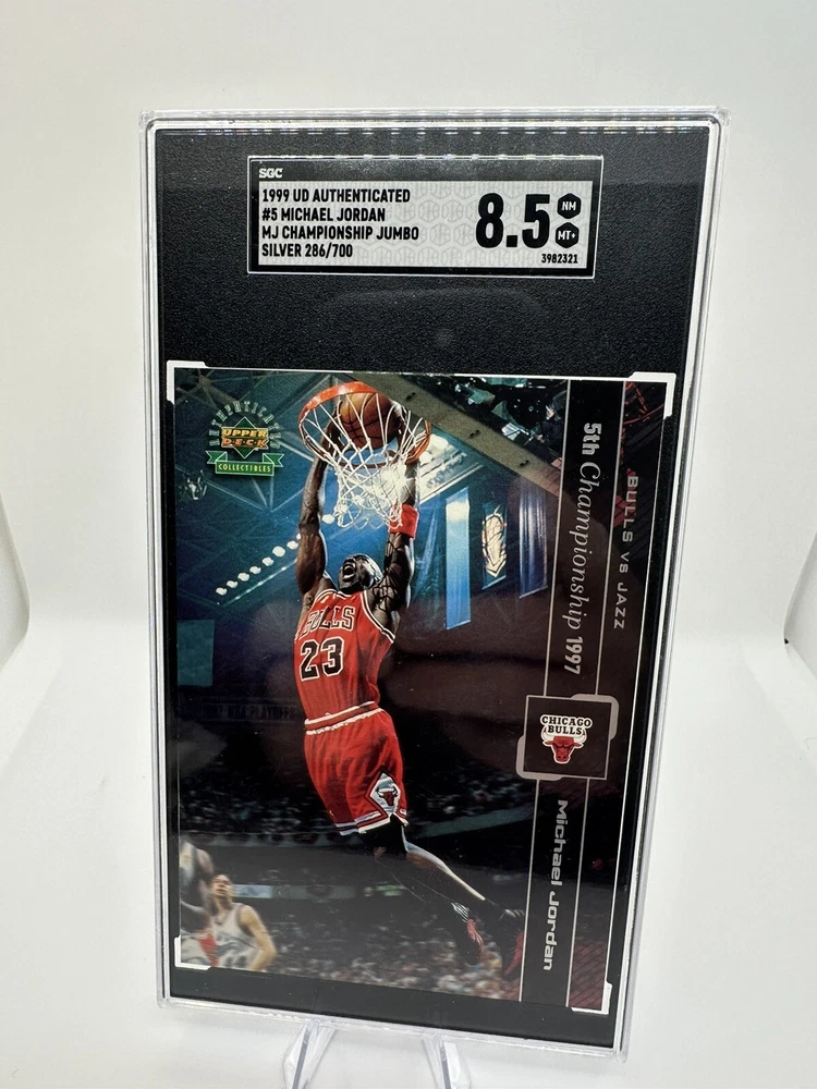 This rare and valuable sports trading card features one of the greatest basketball players of all time, Michael Jordan, in his 1999 MJ Championship Jumbo set. The card is made of high-quality card stock and has a silver parallel/variety with a unique jumbo design. It is also serial numbered, with a limited edition of only 700 cards produced, and this particular card is numbered 286/700. The card is in excellent shape and has been graded SGC 8.5 Mint, ensuring its authenticity and value. It is a must-have for any Michael Jordan or basketball fan and would make a great addition to any collection. Don't miss this opportunity to own a piece of sports history.